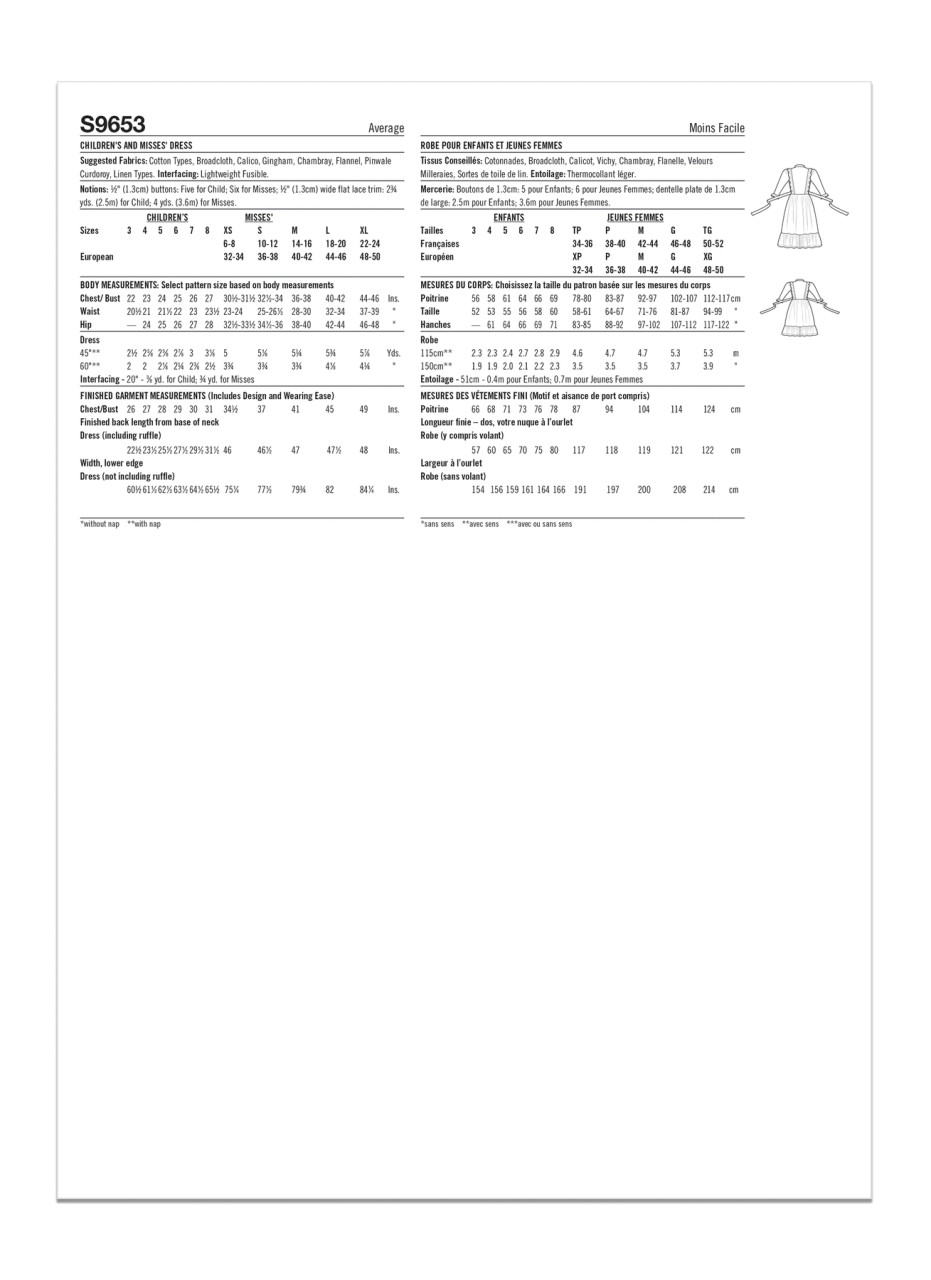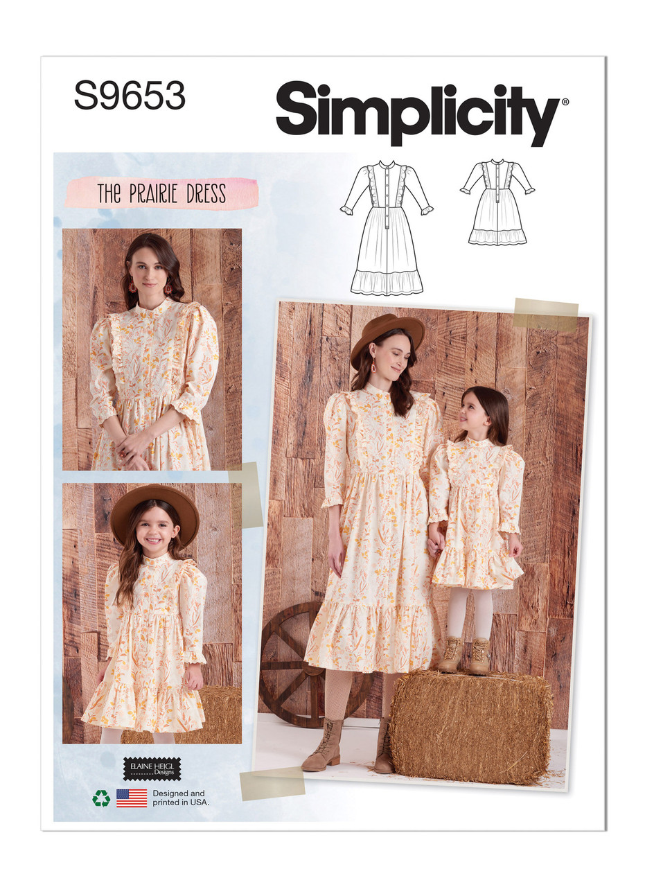 Cottage core prairie dress has front buttoned placket, stand collar, ruffles inserted into front and back princess seams, back tie ends, and three-quarter length puffed tapered sleeves finished with ruffles. Full skirt gathers from waistline seam to mid-calf length with lower ruffle.