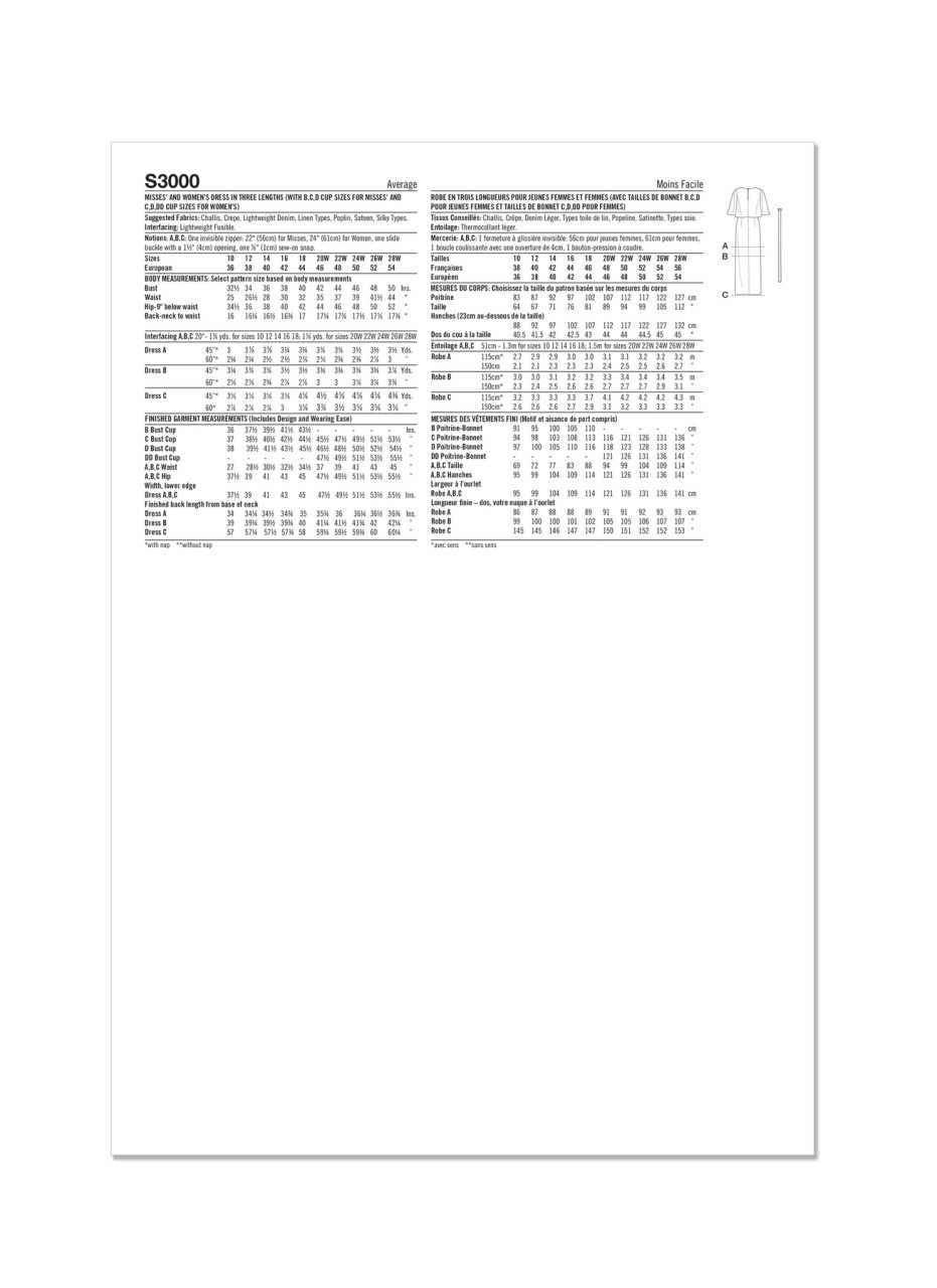 Fitted dress with wide flared sleeves has vertical seams, invisible zipper, and a cape-effect back. Belt can be self-made or purchased. Views B and C have a front slit. Separate pattern pieces for B, C, and D cup sizes for Miss and C, D, and DD cup sizes for Women.