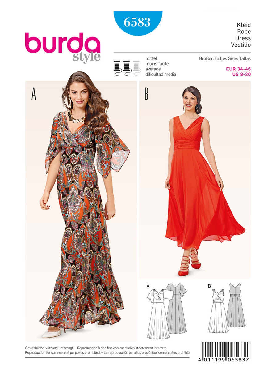 Evening Dress - Draped Fronts - Wide Skirt - Flutter Sleeves. Dance up a storm in a lovely gown for an evening out. The well-fitted bodice is covered with draped fronts, creating a wrap look. The waistband accents your figure. The panel skirt affords plenty of leg room for dancing.