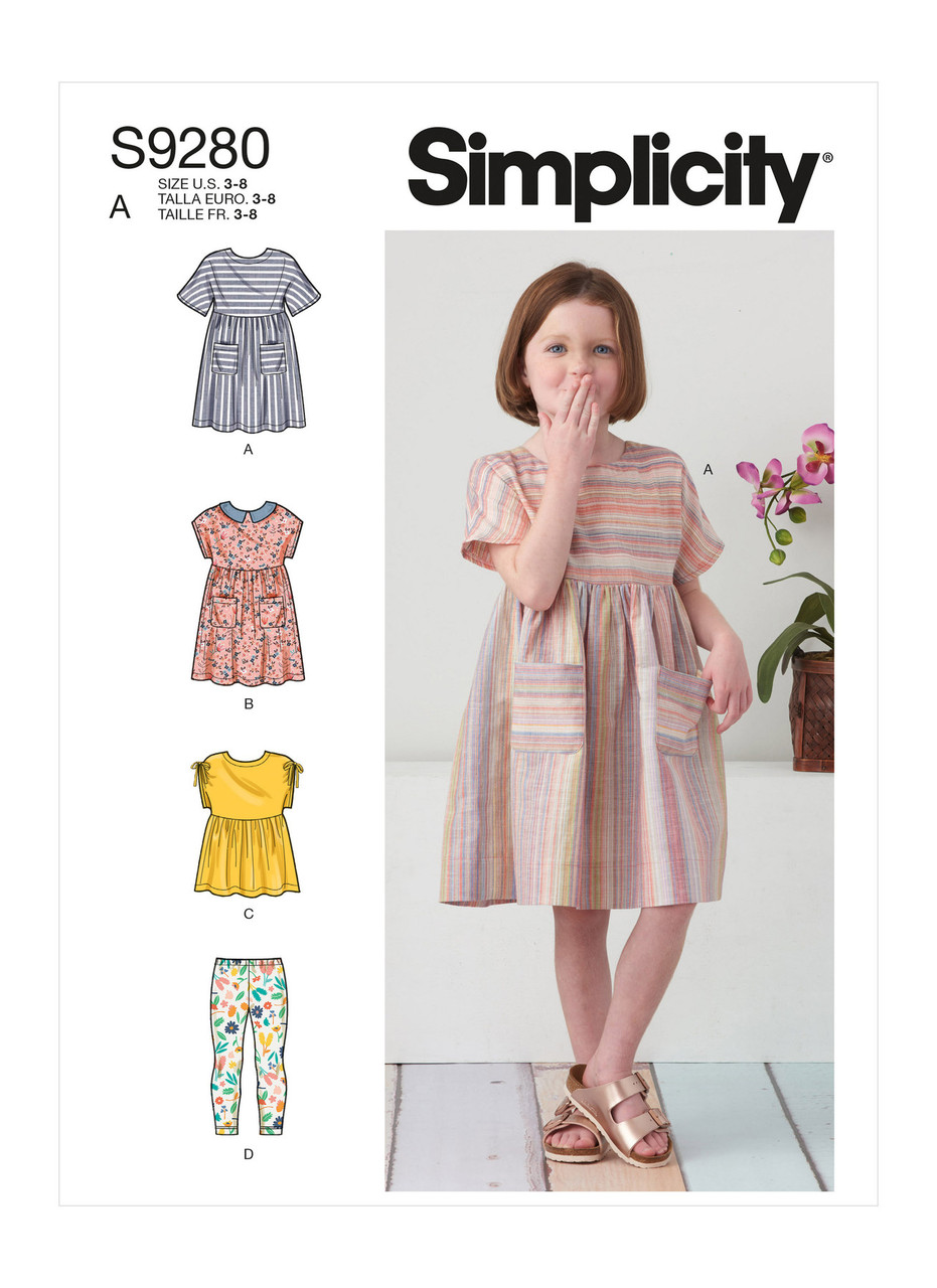 Children's knee-length dresses & top have round neck, all-in-one sleeves, elbow or short length; pocket & collar details; knit leggings.… Read More
