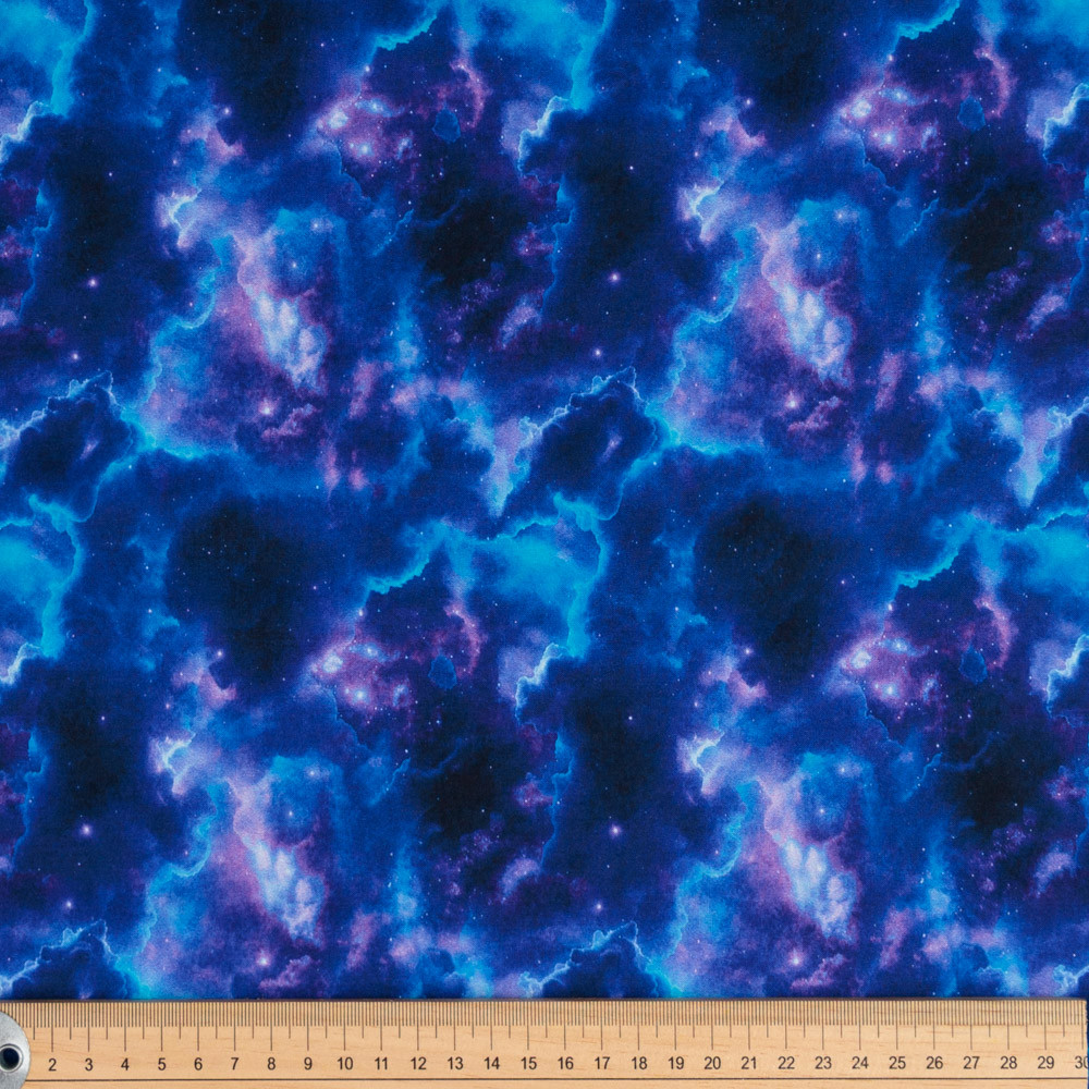 Stormy skies print in royal blue, purple and navy. Beautiful, high quality, printed fabric. Ideal for quilting, masks, crafts, displays, table decoration and as a dressmaking fabric.