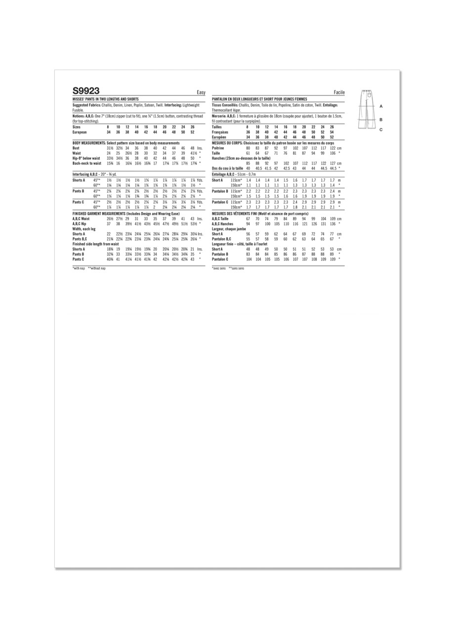 Easy to sew pants and shorts for misses features large shaped pockets, optional contrast top stitch, back darts and zipper closure. View A are long shorts. View B are cropped pants.