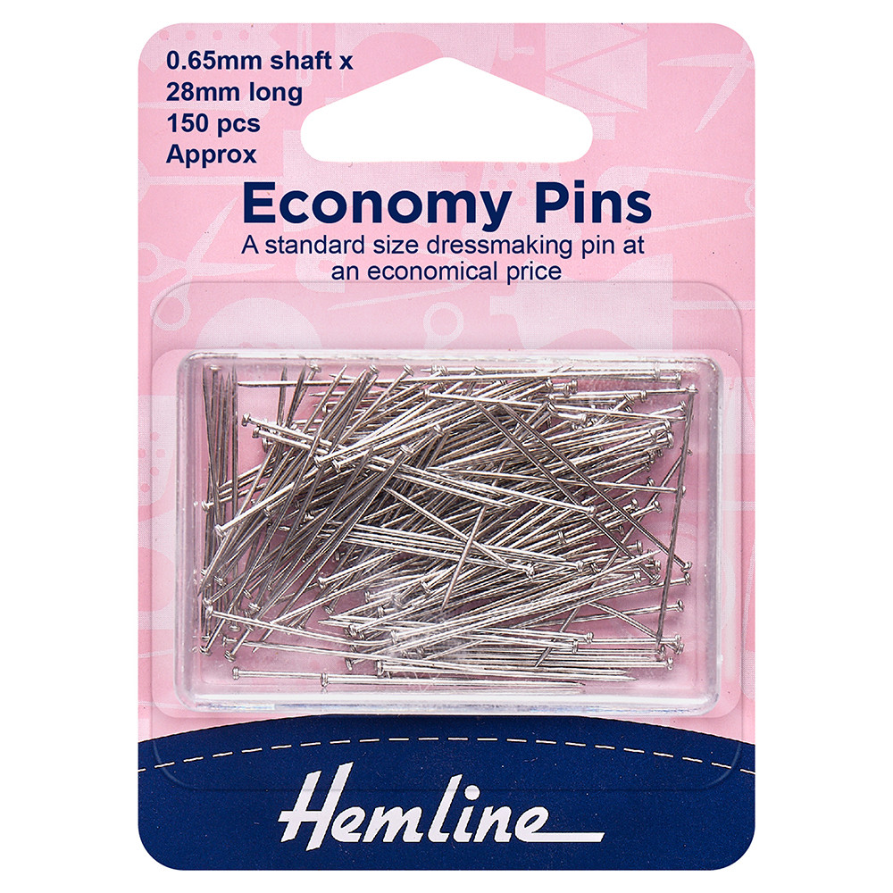 Nickel plated steel pins. Basic standard size dressmaking pins at an economical price. Supplied in a reusable plastic box. 28mm, 150 pieces.