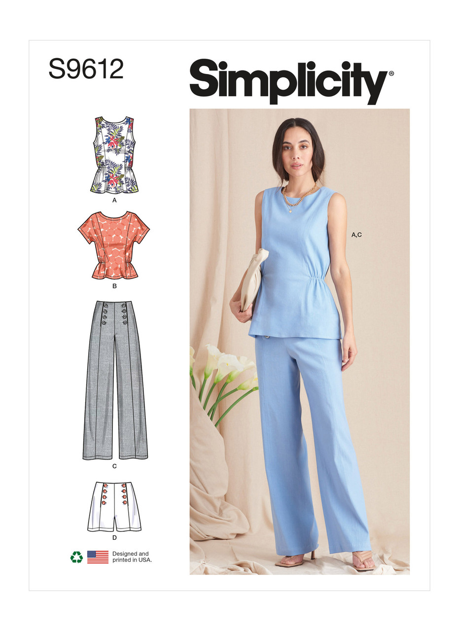 Tops are hip or cropped length with sleeve variations and have princess seams with elastic waist, creating peplum effect. Wide leg pants or shorts with front buttoned flap start 1" below waist.