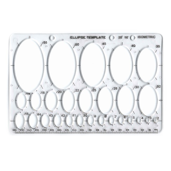 A transparent 13cm 21cm stencil for drawing ellipses or circles in 35° isometric perspective. Features a 190mm ruler and ellipses from 2mm to 50mm. Ma…