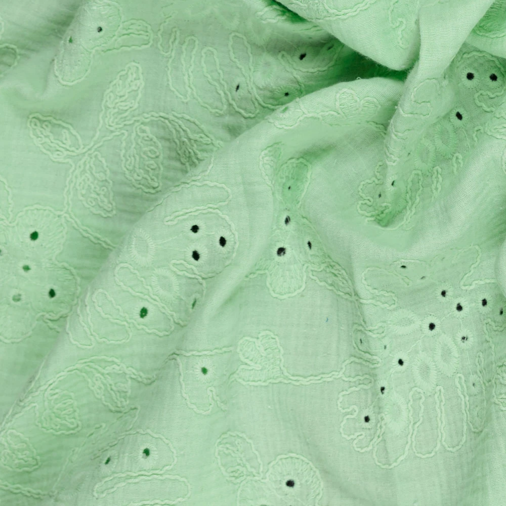 Super soft and airy, this lightweight cotton double-gauze seersucker features a gently puckered, double-faced texture with a naturally breathable feel. The front is delicately embroidered with an intricate leaf and floral design, adding soft dimension to the fresh mint base. Semi-sheer in areas due to the gauze structure, it’s perfect for layered summer dresses, relaxed shirts, and flowing skirts with a light, romantic finish.