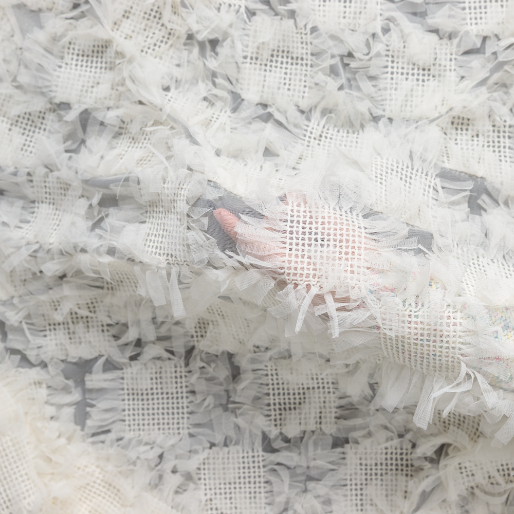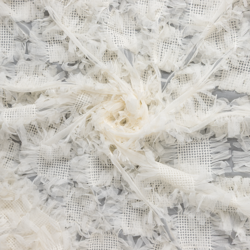 Sheer drama, quite literally. This Embroidered Tulle Strips Check in Ivory is anything but ordinary—its surface is divided into crisp 2" squares, alternating between airy, plain tulle and a sculptural 3D grid woven from softly ruffled strips. The result? An ethereal play of volume and texture that shifts with every movement.