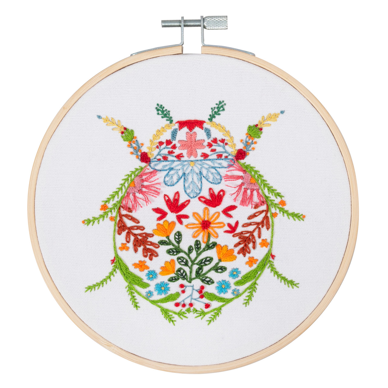 Embroidery kit with hoop. Kit Includes: 15cm bamboo hoop; pre-sorted, 6-strand, polyester embroidery threads; embroidery needle; cotton fabric with pre-printed design; felt backing and instructions in EN/FR/DE/ES/IT/NL. Approximate finished size: (diam) 15cm. Fabric size (w/h) 25 x 25cm. Do not dry clean. hand wash in cold or warm water. Use a gentle detergent.