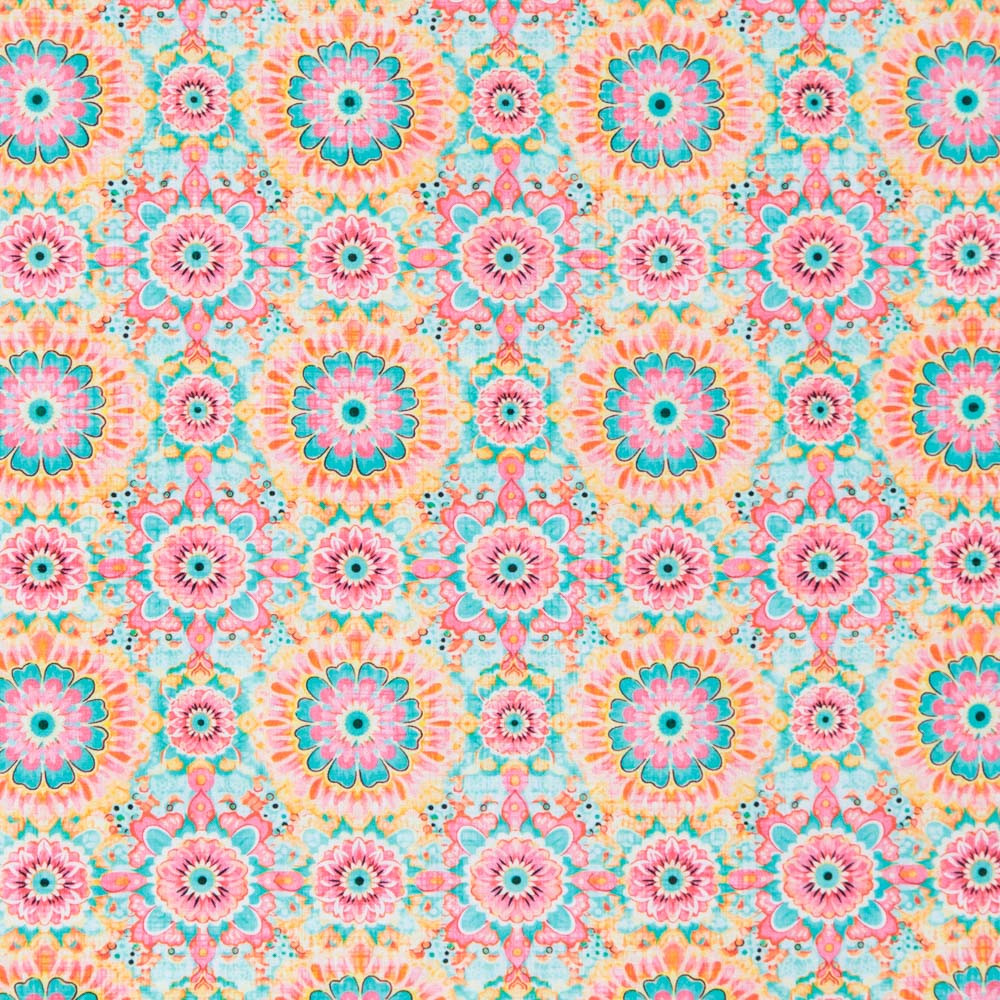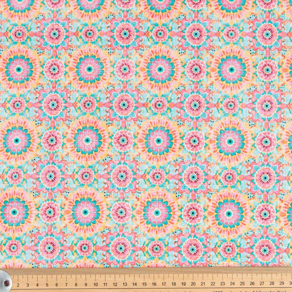Mandala like floral repeating tile print in tones of yellow, pink, aqua and turquoise. Beautiful, high quality, printed fabric. Ideal for quilting, masks, crafts, displays, table decoration and as a dressmaking fabric.