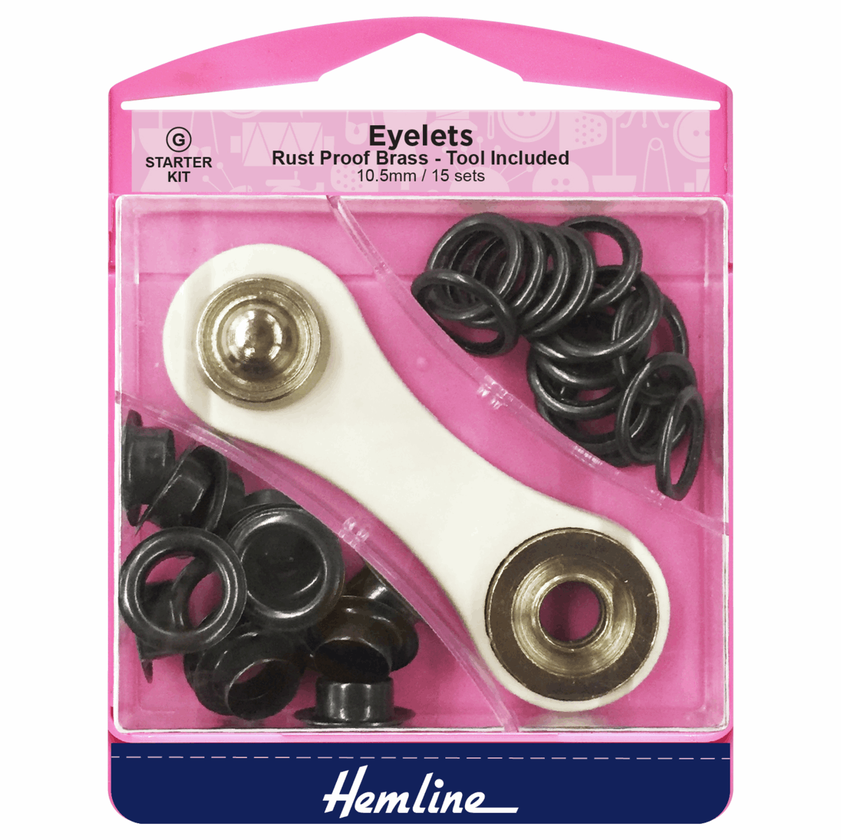 Starter set contains: eyelets, washer, hole punch and eyelet tool. Featuring all new non-spill plastic case and all new higher quality application tool.