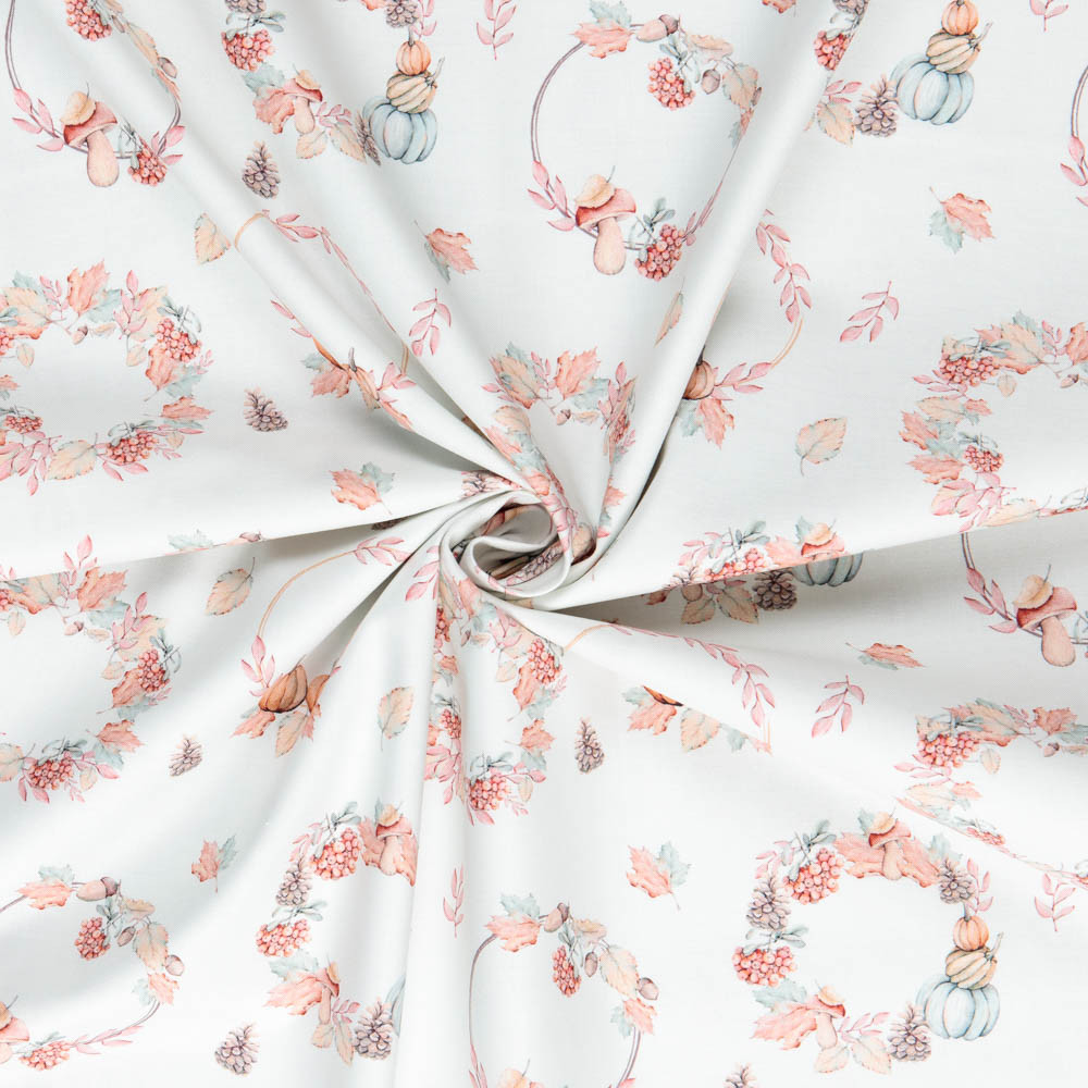 Premium organic cotton prints designed by Mari Caliart featuring beautiful water coloured autumnal images, such as leaves and mushrooms. Beautiful, high quality, printed cotton fabric. Ideal for quilting, masks, crafts, displays, table decoration and as a dressmaking fabric.
