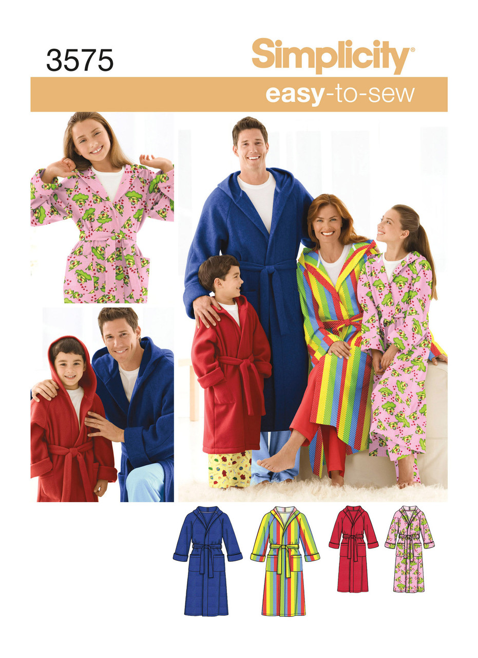 Unisex robe with hood suitable for the whole family can be made in cotton, flannel, terry cloth or for extra warmth fleece. Not suitable for sleepwear. NOTE: if used as sleepwear, use fabrics and trims that meet the flammability standards set by the U.S. Government.