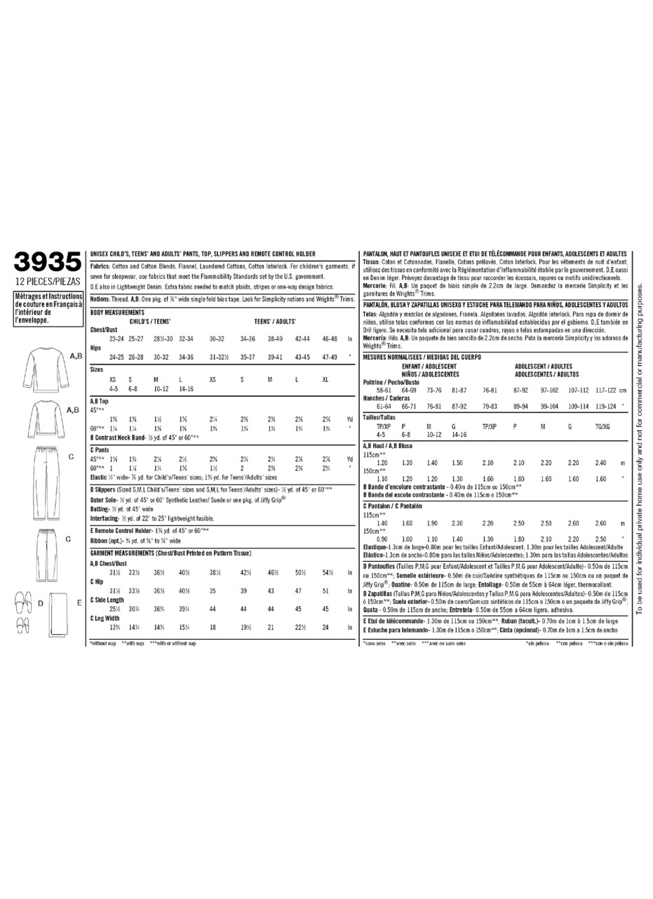 Unisex Child, Teen and Adult lounge pants, top, slippers and remote control holder. NOTE: if used as sleepwear, use fabrics and trims that meet the flammability standards set by the U.S. Government.