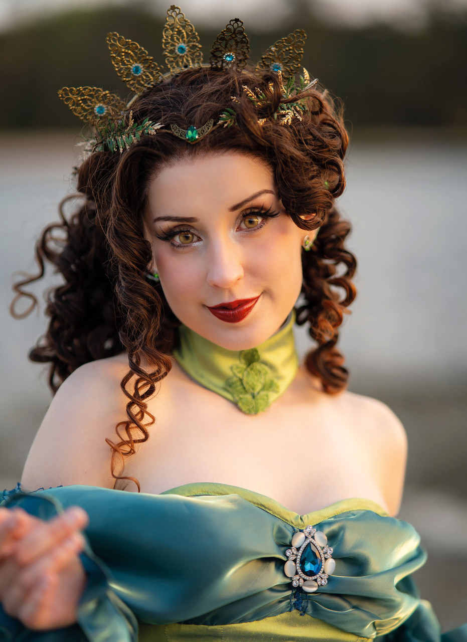 Water fairy costume has lined boned corset with back lacing, draped bodice overlay, elasticized poet sleeves and floral motif trim and purchased brooch embellishments. Attached lined mermaid skirt has back godet, shaped princess seams and dramatic draping and back train. Adjustable separate collar has floral motif trim embellishment and back lacing with grommets. See envelope for more information.