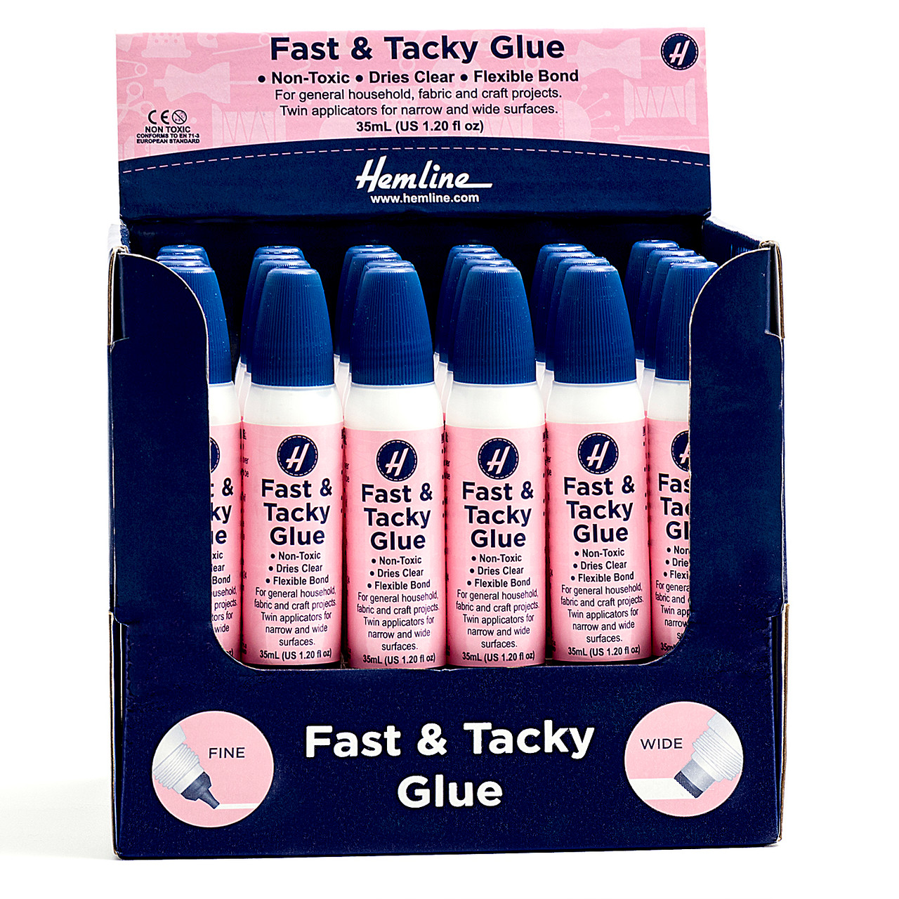 For general household, fabric and craft projects. Twin applicators for narrow and wide surfaces. Non-toxic, water-based PVA glue. Dries clear. Flexible bond.