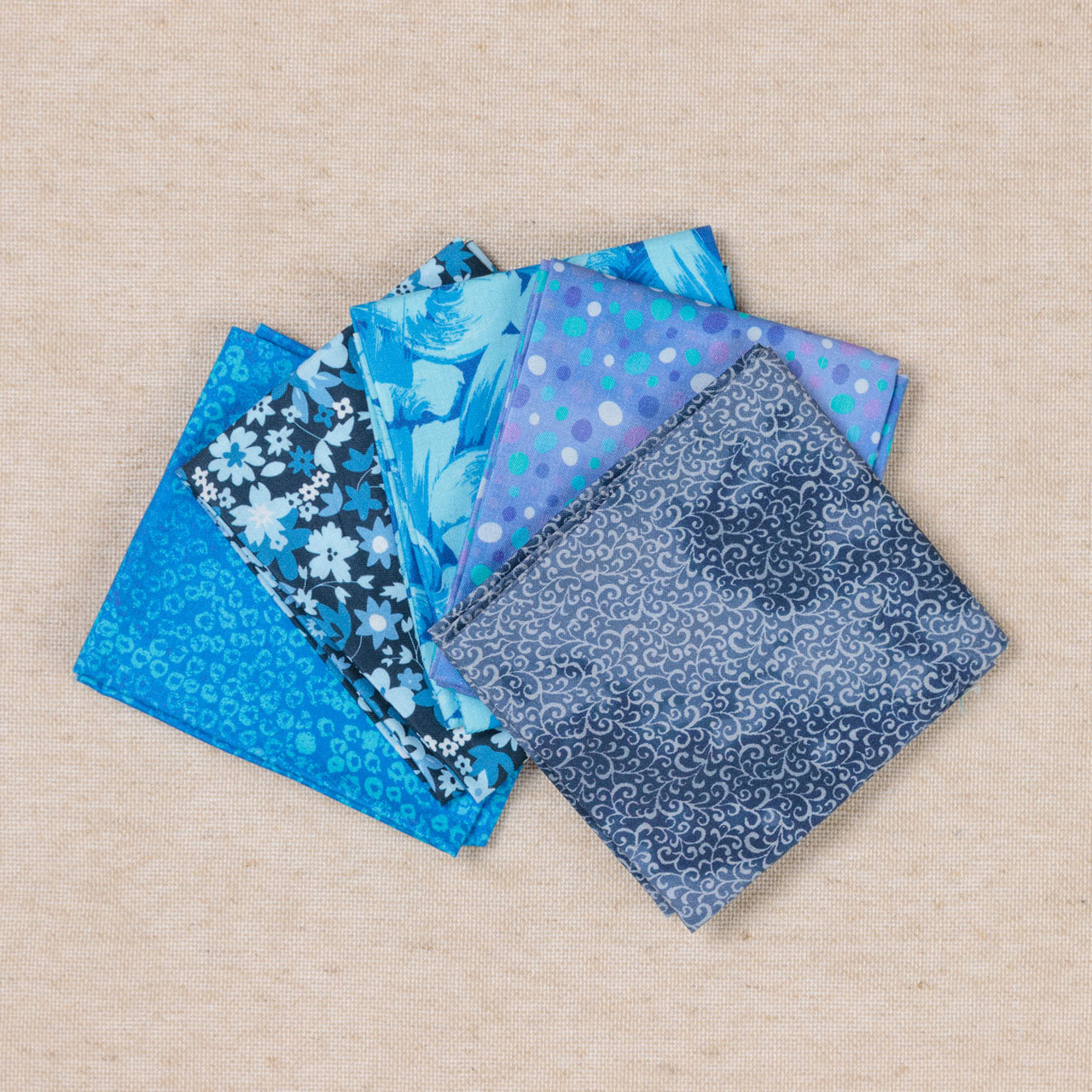 Printed cotton fabrics featuring various patterns in blues and purples.