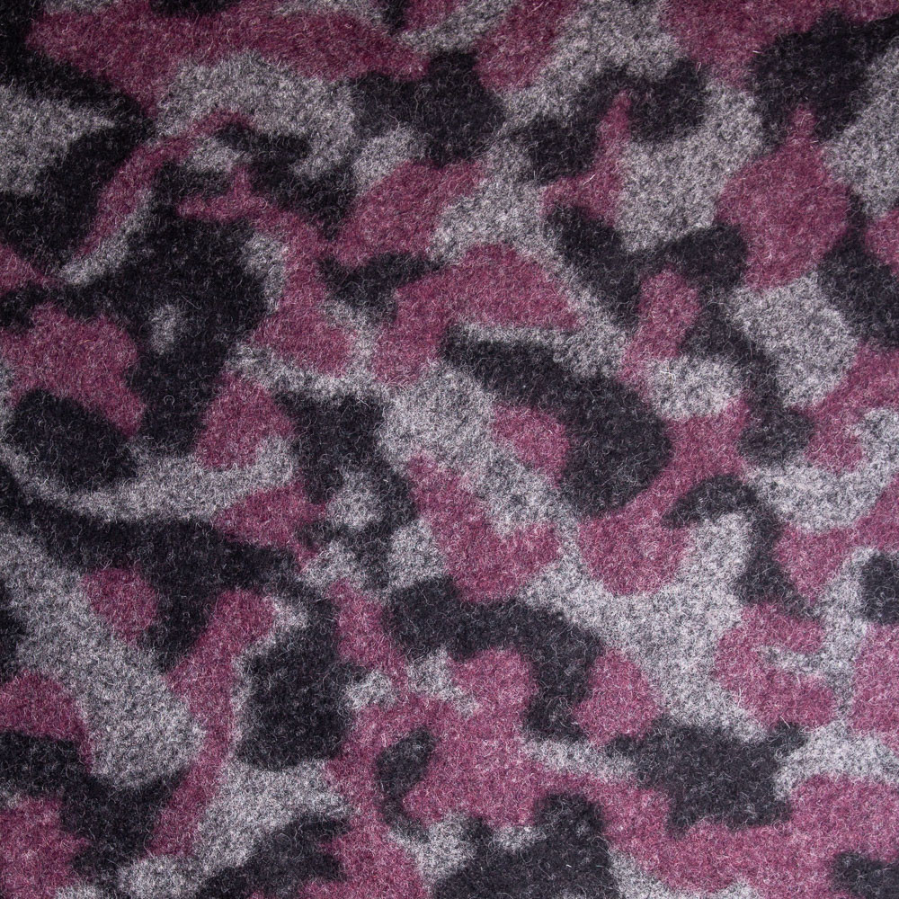 Get the look with this Felted Wool Coating: Grey/Purple Cameo. You’ll find all the things you typically expect from a camouflage (bulbous shapes and earthy tones) Smooth and slightly fuzzy, create cocoon coats, overcoats or peacoats. Thin with a medium weight, it falls and hangs with ease for longer coating applications. Opaque, a lining is optional depending on its application. In rustic neutrals with a pop of berry, create the perfect look for fall and winter.