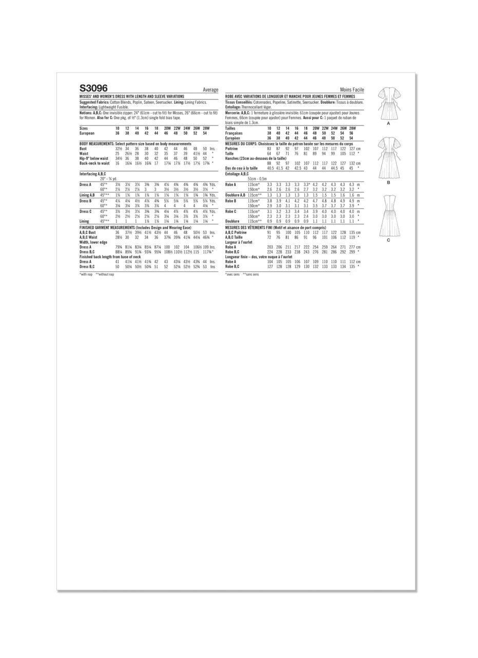 Fit and Flare dress sewing patterns have surplice V-neck, gathers at skirt, side pockets, narrow hem and invisible back zipper closure. Views A and B have dropped shoulders, bubble sleeves and self-ties inserted into back darts. View D dress is sleeveless armholes finished with bias tape.