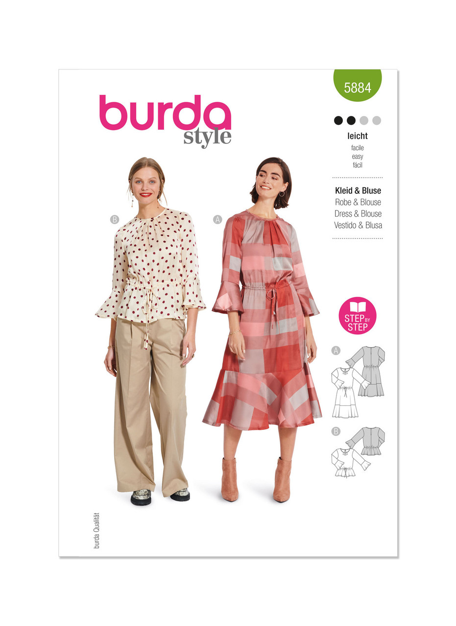 This dress with pretty flounces at the sleeves and skirt can be adjusted at the waist with a drawstring. There is binding at the neckline and small pleats create a bit more volume while also adding to the generally playful look of this style. The same pattern can be used for the hip length blouse featuring a flattering peplum.