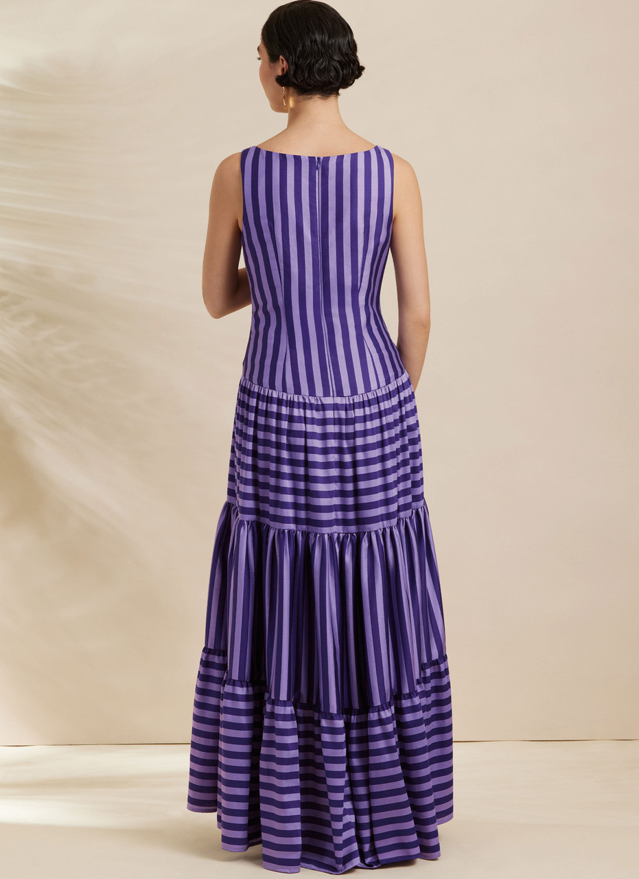 Fitted, tank dresses have scoop neckline, hi-low hem, tiered gathered skirt and invisible zipper closure. View C dress has contrast.