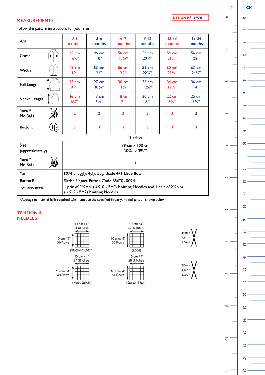 1 pair of 3¼mm (UK10 - USA3) Knitting Needles and1 pair of 2¾mm (UK12 - USA2) Knitting Needles. 3 buttons.