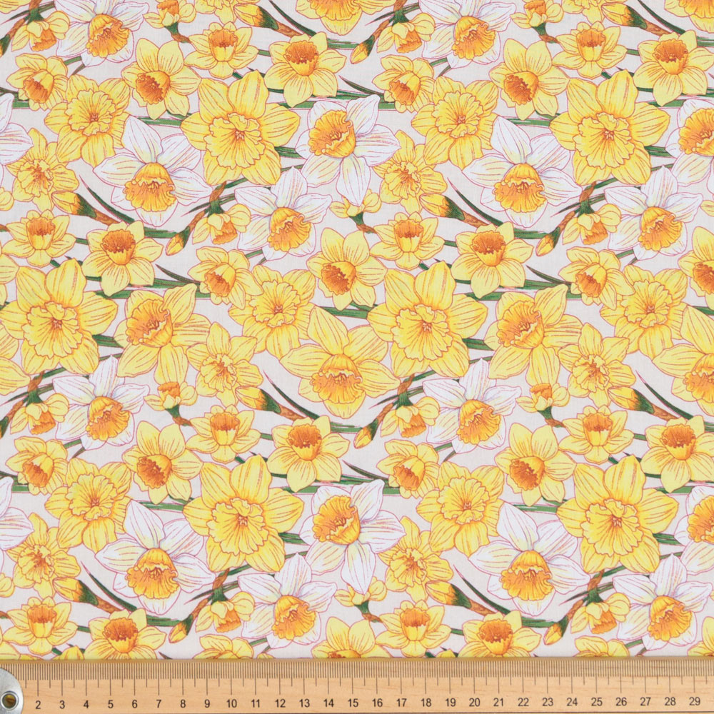 Daffodils on light beige. Beautiful, high quality, printed cotton fabric. Ideal for quilting, masks, crafts, displays, table decoration and as a dressmaking fabric.