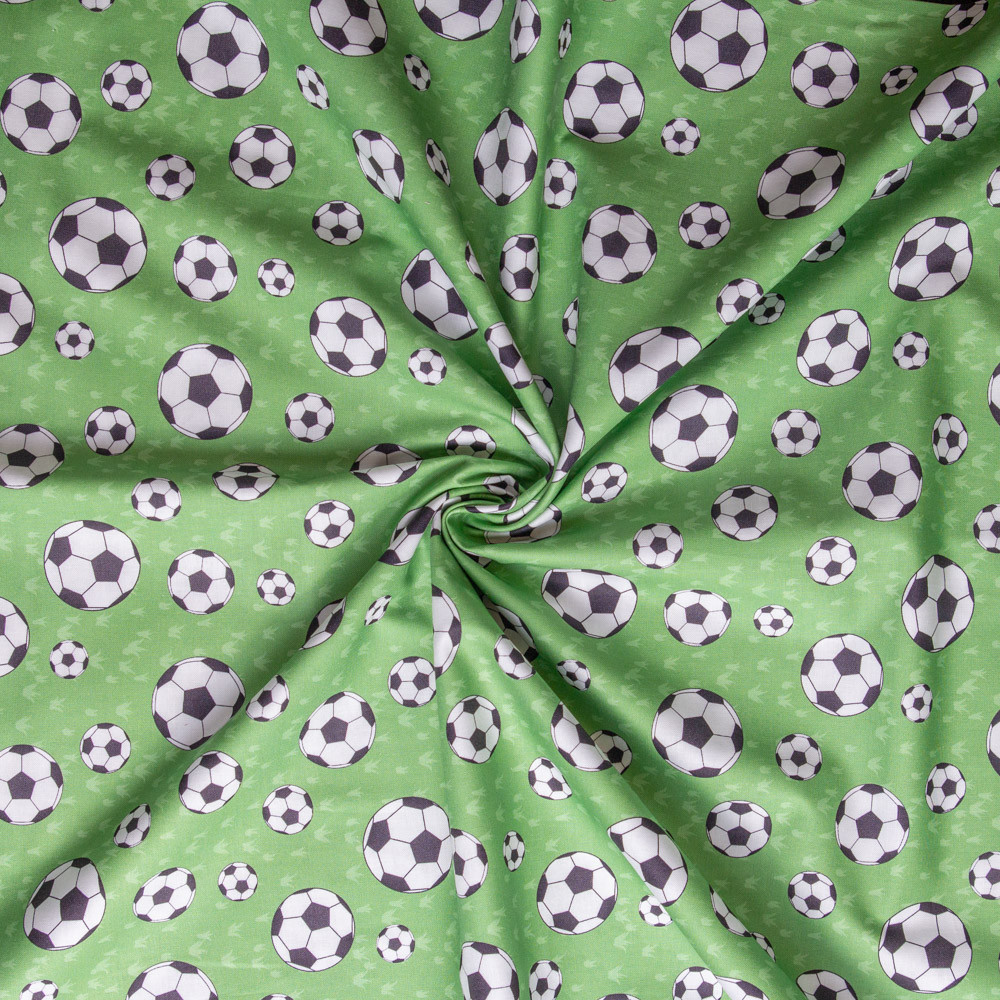 Footballs on green. Beautiful, high quality, printed cotton fabric. Ideal for quilting, masks, crafts, displays, table decoration and as a dressmaking fabric.