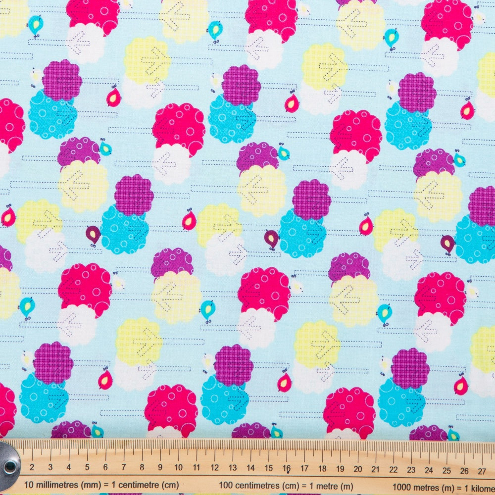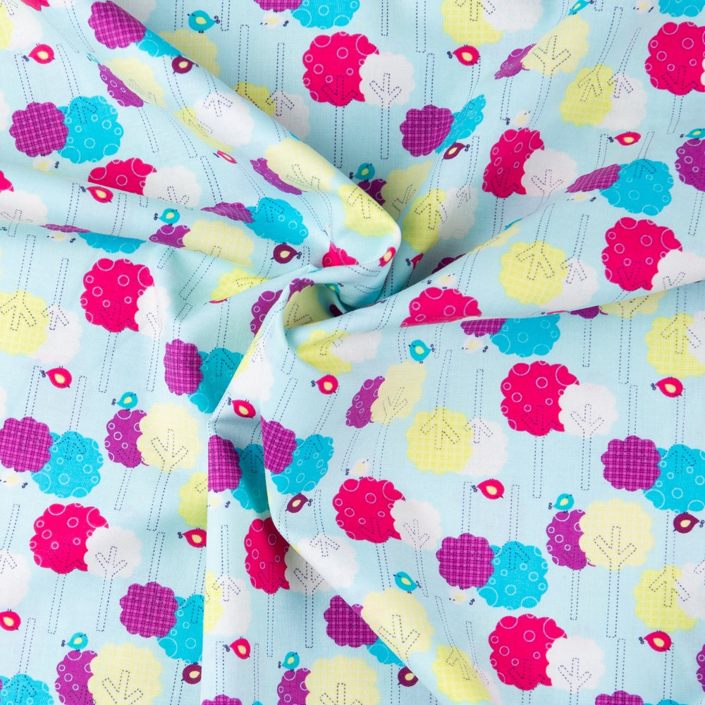 Bright multicoloured patterned trees on a baby blue background. Beautiful, high quality, printed cotton fabric. Ideal for quilting, masks, crafts, displays, table decoration and as a dressmaking fabric.