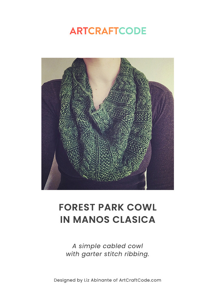 A simple cabled cowl with garter stitch ribbing. Asymmetrical in shape the Forest Park Cowl becomes wider partway through your knitting to allow for a more stylish slouch when worn. The simple repetitive cable pattern is spaced by garter stitch ribbing to give this cowl a classic, textured look.