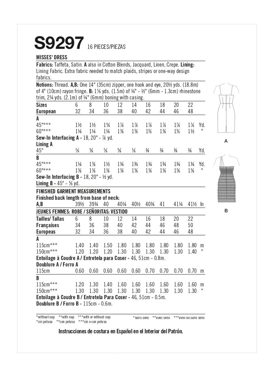 Close-fitting dress has lined bodice with boning, lapped center back zipper & back vent. A: sweetheart neckline & self fabric straps. B: purchased rhinestone trim straps & fringe trim.