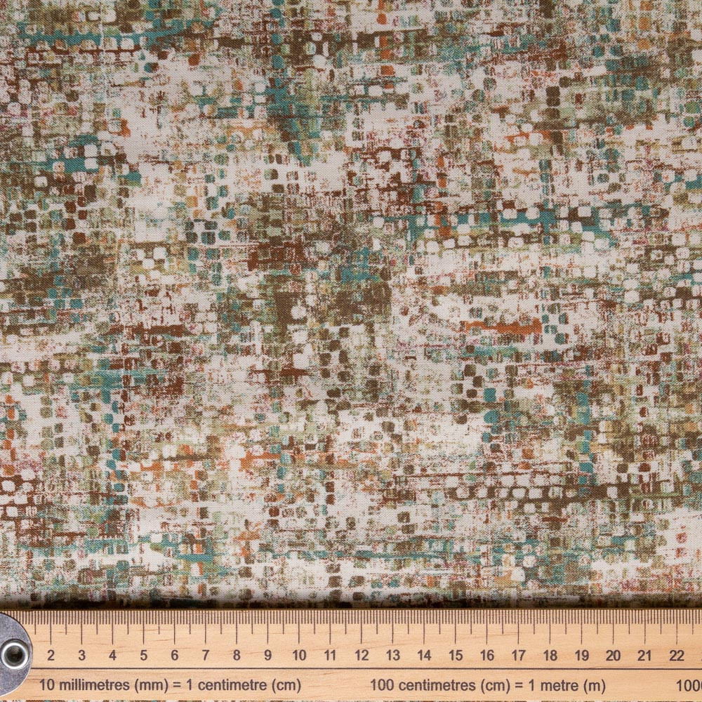This textured mosaic pattern in greens and browns is ideal as a quilting blender. Beautiful, high quality, printed cotton fabric. Ideal for quilting, masks, crafts, displays, table decoration and as a dressmaking fabric.