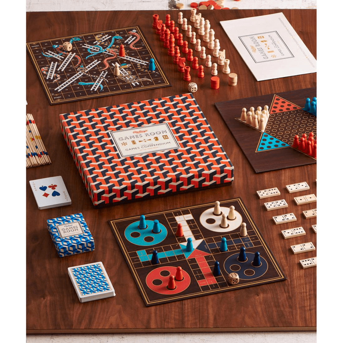 In the box are all the classic games you could ever need. Here to test your strategy, skill and luck, gather your friends and family for ten timeless games, suitable for all ages. Let the games begin! Includes Backgammon, Chess, Chinese Checkers, Dominoes, Checkers, Snakes and Ladders, Nine Men Morris, Ludo, Pick-up Sticks and Playing Cards.