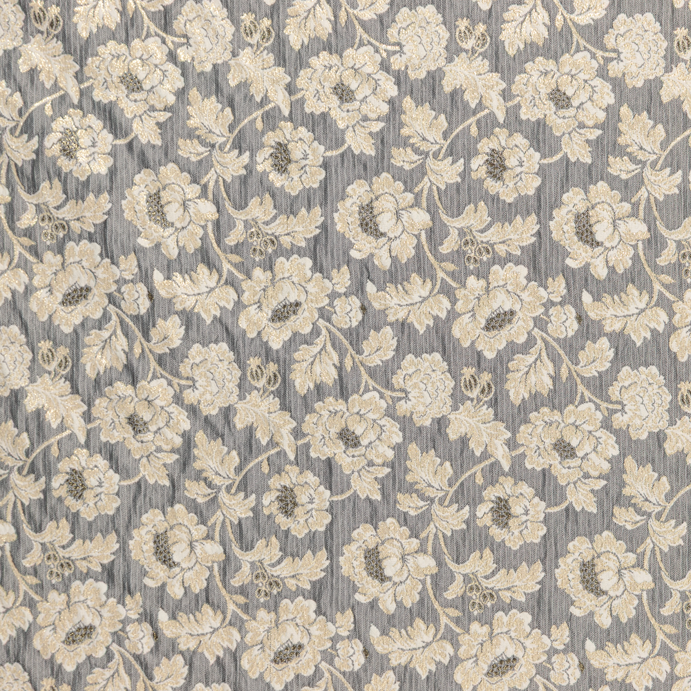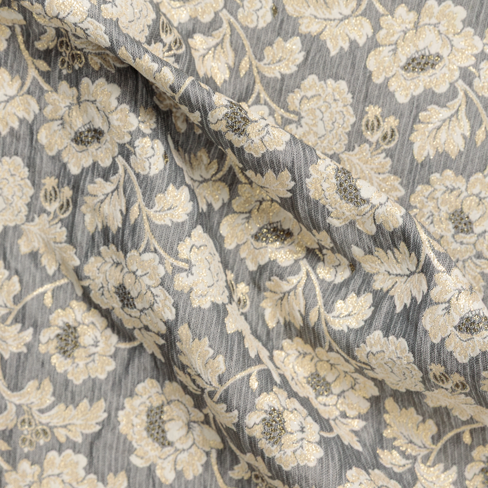 Drama? Delivered. This Gold Metallic Floral on Silver Brocade is a vision in opulence, with radiant gold florals blooming across a silvery beige and black base. With a richly textured, tactile hand and no stretch, this structured brocade is designed for standout silhouettes. Perfect for voluminous circle skirts, A-line cocktail dresses, sculptural jackets, and red carpet-worthy moments. Though the fabric is opaque, a lining is recommended for comfort and added finesse. When your look calls for grandeur, this brocade answers with a flourish.