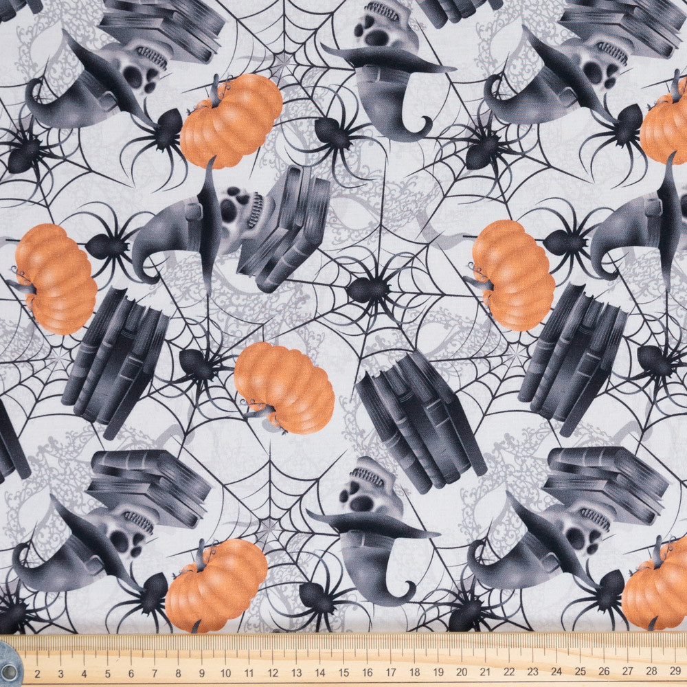Orange pumpkins give a pop of colour on this otherwise monochrome Witchy print. Perfect for Halloween. Beautiful, high quality, printed cotton fabric. Ideal for quilting, masks, crafts, displays, table decoration and as a dressmaking fabric.