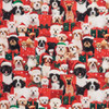 Red base with dogs faces wearing christmas hats. Beautiful, high quality, printed fabric. Ideal for quilting, masks, crafts, displays, table decoration and as a dressmaking fabric.