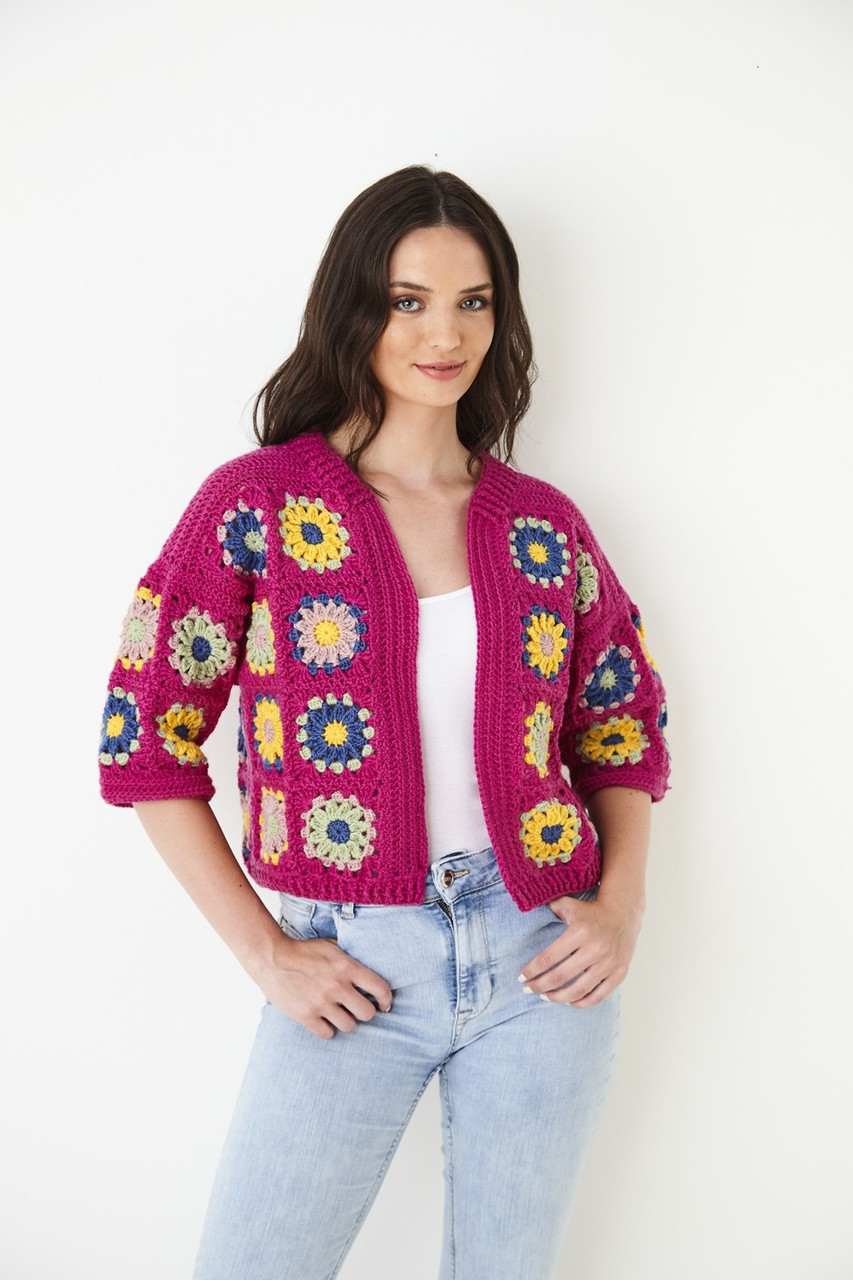 Designed by Eleonora Tully, this Granny Square Pattern is a beautiful ‘on-trend’ Long Cardigan and Cropped 1/2 Sleeve Cardigan Crocheted in Merino Blend DK.