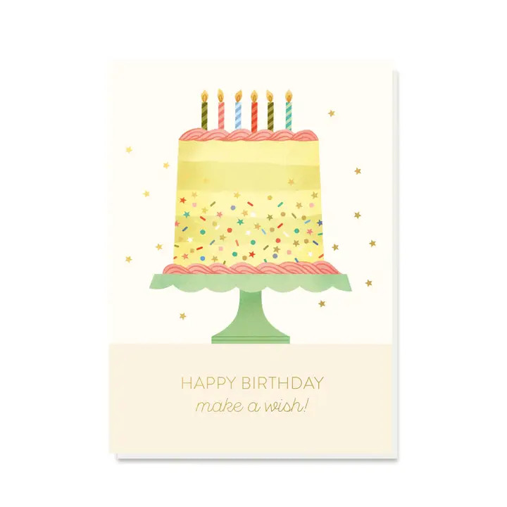 Scandi Style birthday card featuring a delicious birthday cake with gold sprinkles! Illustration by Clare Owen, finished with gold foil.