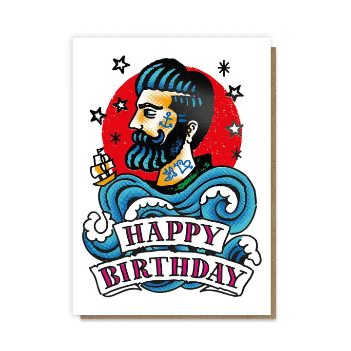 Our 'Inked' collection is inspired by classic tattoo design - featuring vintage typography, iconic imagery and bright saturated colours, and finished with black hot foil that creates truly striking greeting card designs. We love how the black foil leaves a bold indentation on the paper stock - reminiscent of letterpress printing - but the satin foil leaves a textured leathery finish to the cards. Experimenting with coloured foils and different printing techniques has become a bit of an obsession for us and by working with print finishes that really reflect the illustration style and concept has created truly striking deisgns.