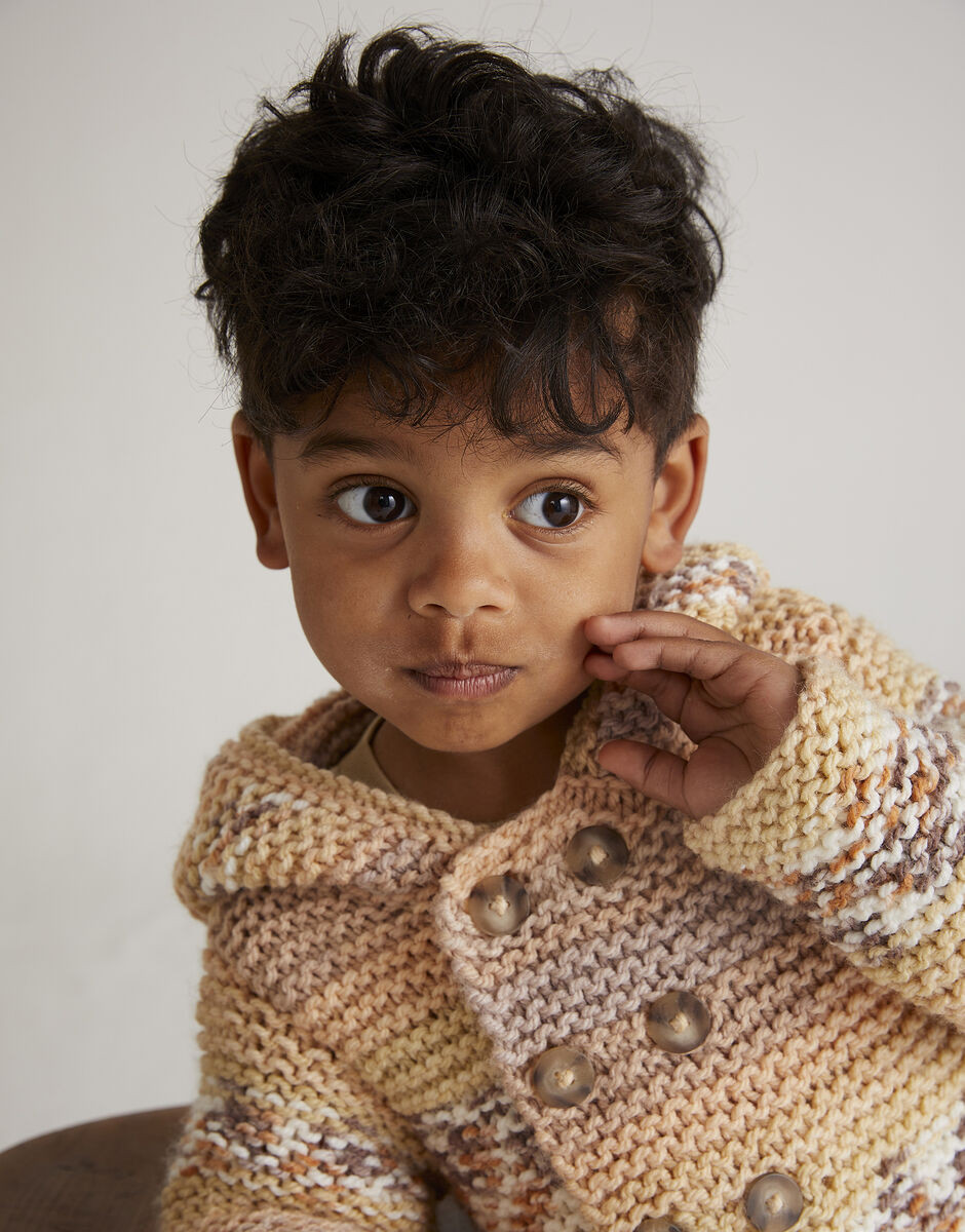 Button up with the Grow Your Own Duffle Coat knitting pattern for one to four year olds! Knit entirely in simple garter stitch, this cosy, double-breasted coat knitting pattern has a T-shaped hood and semi set in armhole.