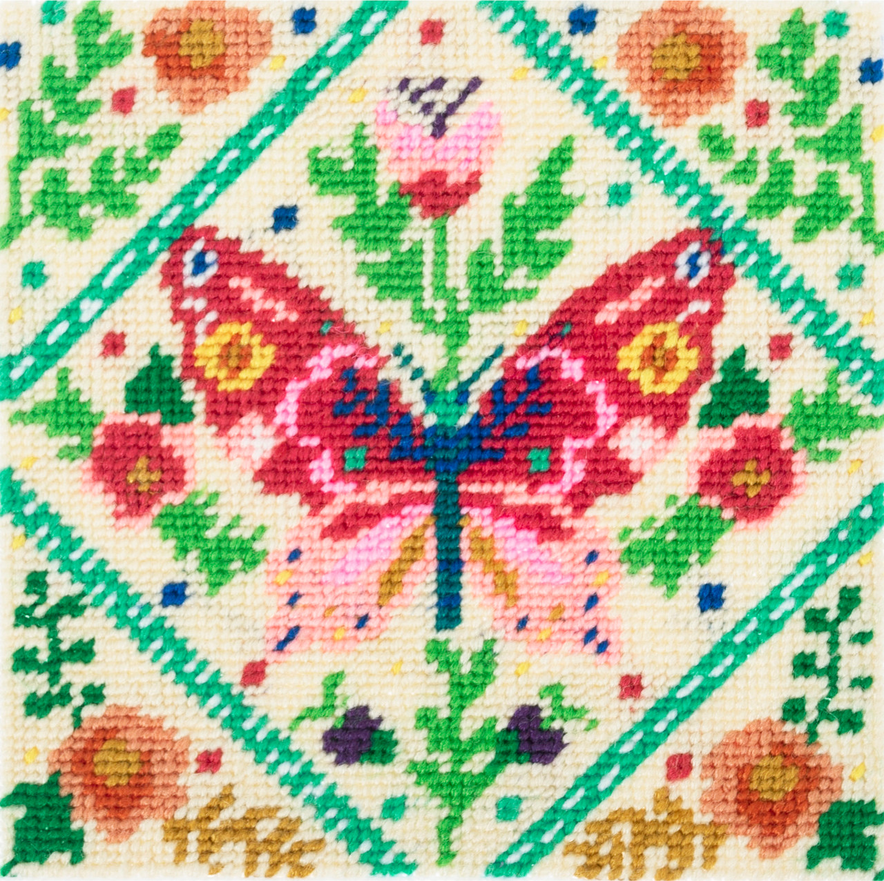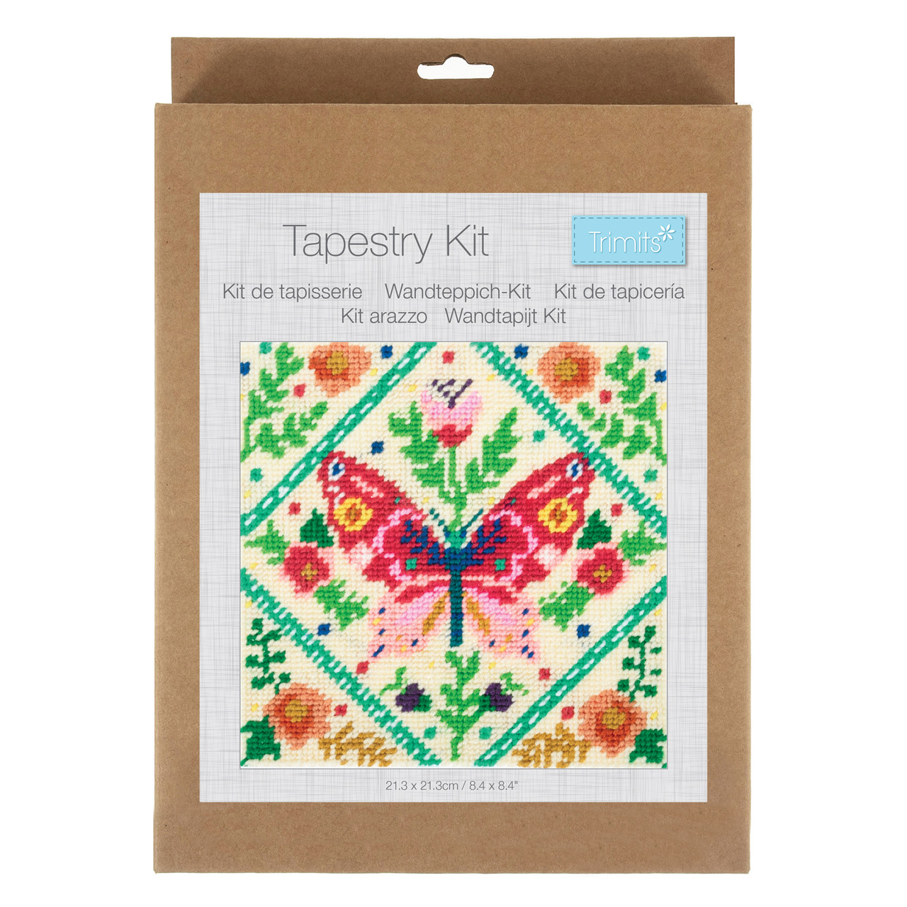 Half stitch/tapestry kit. Kit includes: 12 count pre-printed canvas; acrylic yarns; metal needle and printed colour coded instructions and chart in languages EN/FR/DE/ES/IT/NL. Approximate finished size of design: (w/h) 16.2 x 16.2cm. Fabric size: (w/h) 21.3 x 21.3cm. Do not wash.