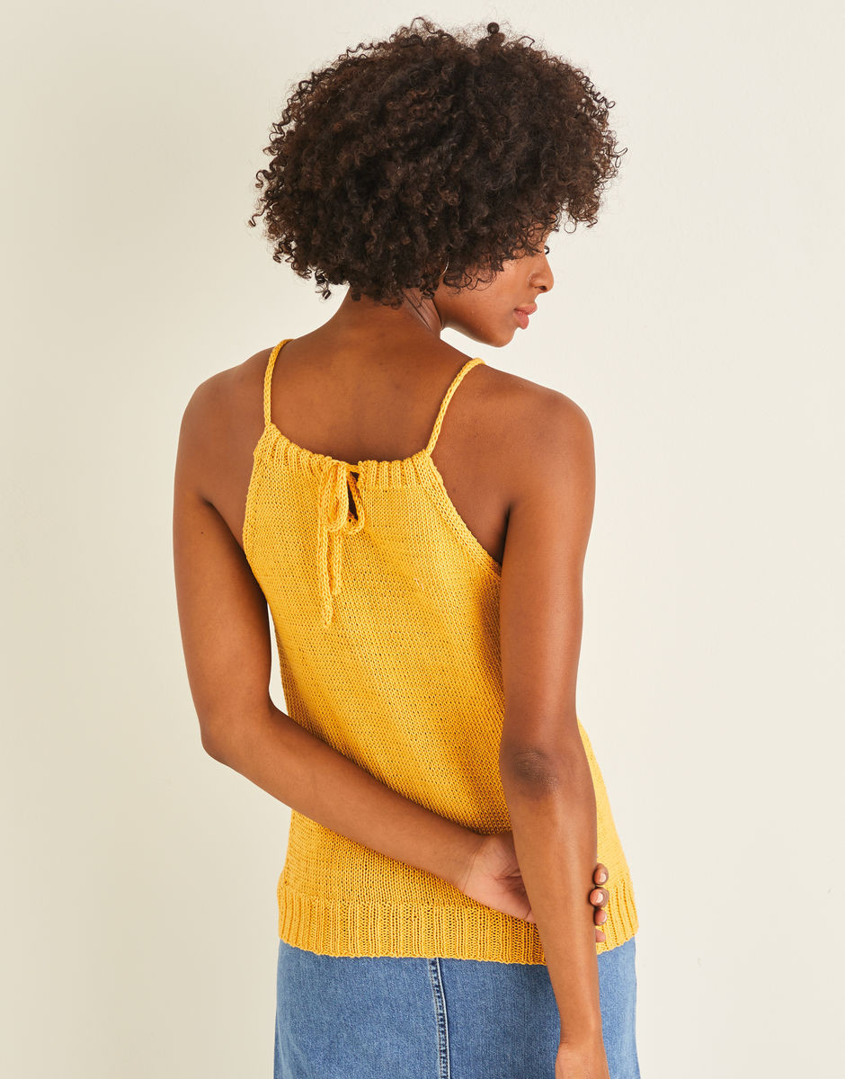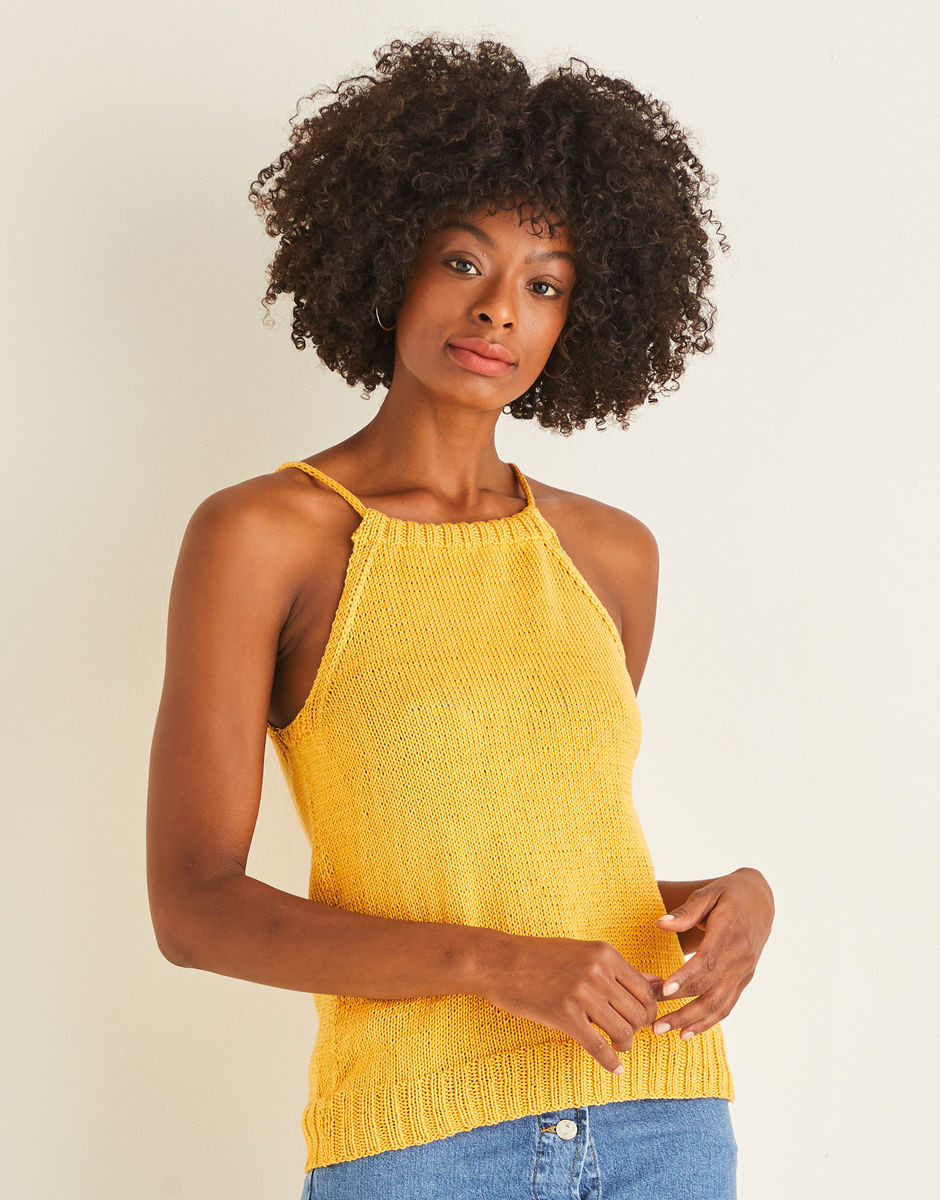 This halter neck tank is the perfect partner for your favourite high-rise jeans or denim skirt this summer. Fastened with a pretty I-cord neck tie, the subtle sheen of Sirdar Cotton DK yarn enhances stitch definition.