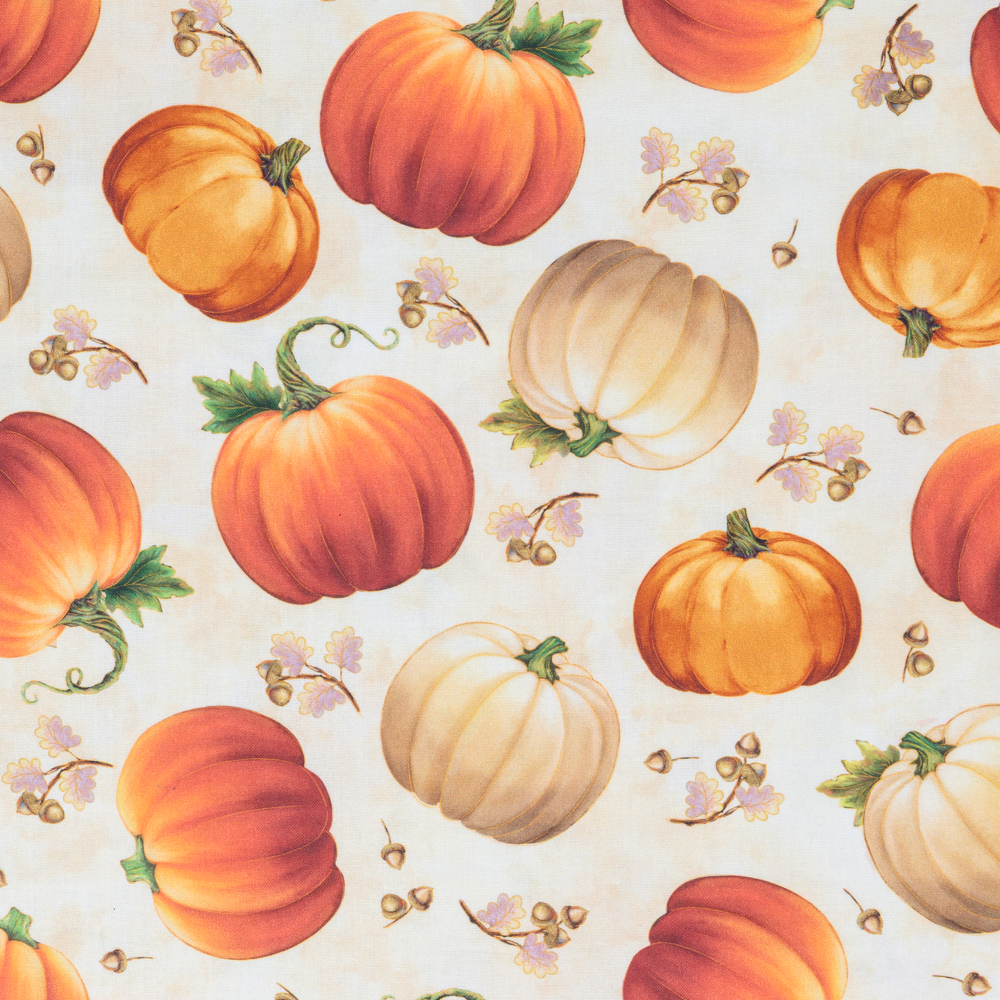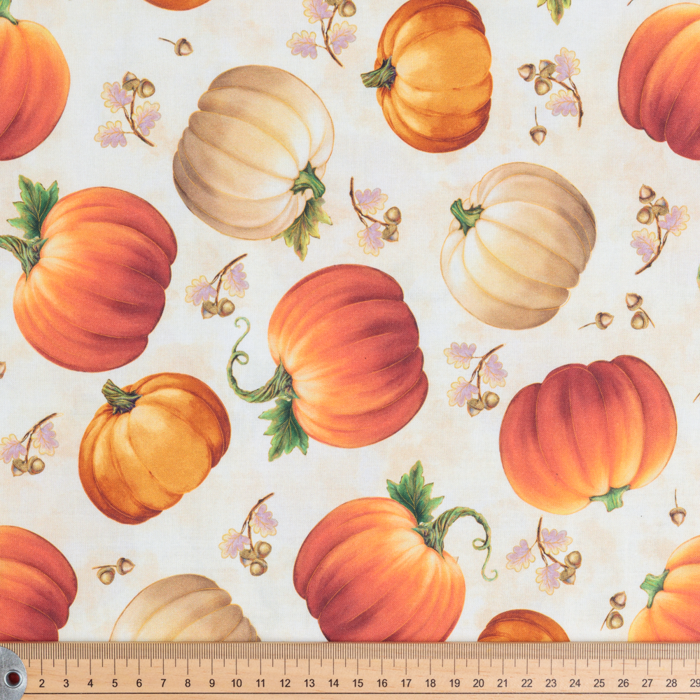 Pumpkins on ecru. Beautiful, high quality, printed cotton fabric. Ideal for quilting, masks, crafts, displays, table decoration and as a dressmaking fabric.