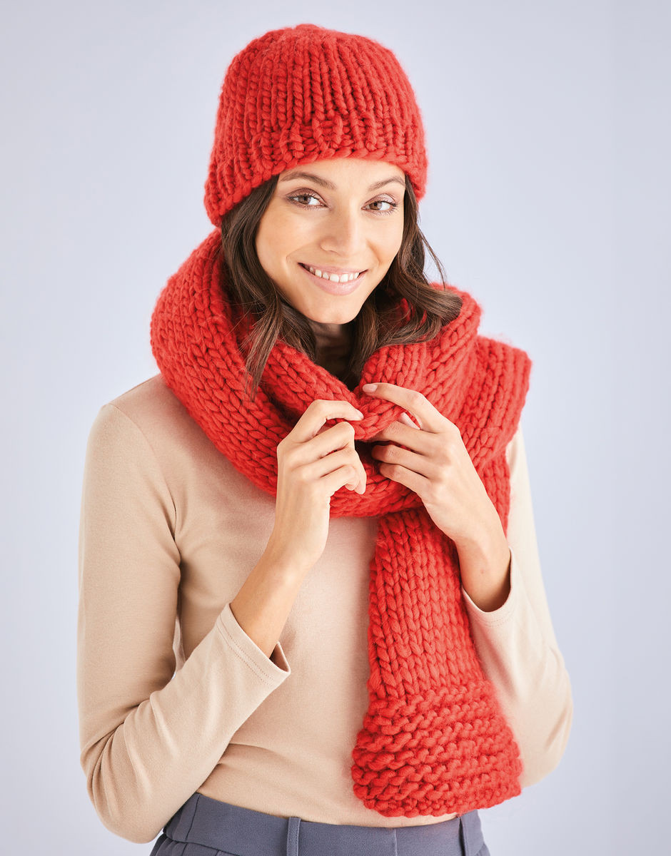 This super chunky hat and scarf set in the soft roving style wool blend of Sirdar Adventure make a super quick knit. With a range of sophisticated melange shades to choose from, you can knit a set to match each of your favourite winter coats.