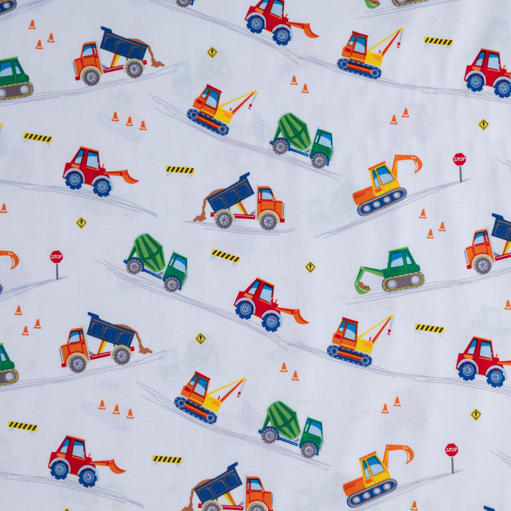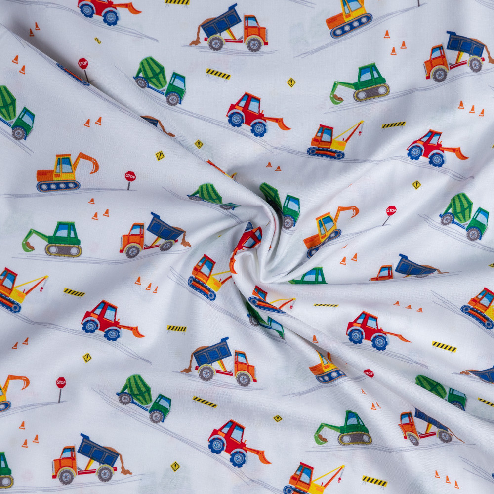 Colourful print of diggers, tractors, dumper trucks and more on a white background. Beautiful, high quality, printed cotton fabric. Ideal for quilting, masks, crafts, displays, table decoration and as a dressmaking fabric.