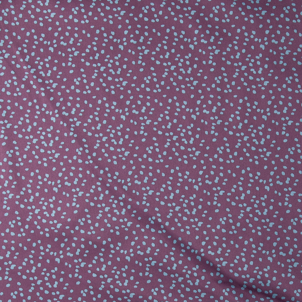 Prepare your sketchbooks and bring those gown ideas to life! With a very decent stretch through the bias, this high-quality polyester has a stunningly subtle shimmer. Transform this effortlessly chic medium, with its springy drape, into stunning, fashion-forward silhouettes. Call to the spirits with body-hugging looks, both full and lightly tailored; transcend your vision with gathered blouses or tanks; channel trendy fashion in a spunky jacket or blazer dress, and more! The speckled simplicity of the teal dots in this pattern is effortlessly cool. Let the dark and moody plum purple be your base palette for your creations.
