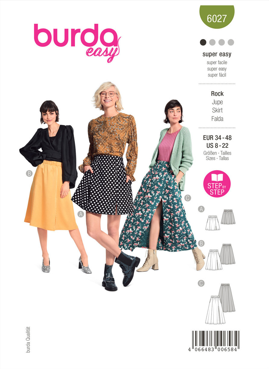 Flared panel skirts flatter every woman - choose your best length from mini to midi! The elasticated waist ensures a comfortable fit. Pockets in the side seams and a stylish slit are easy details to sew.