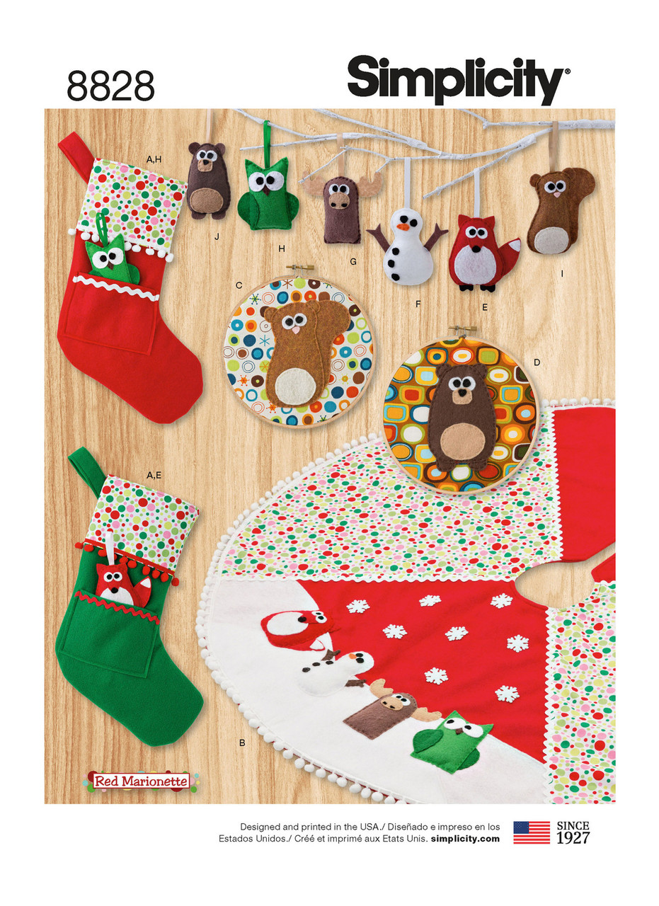 Add a personal touch to your décor this holiday season with these unique decorations. Pattern includes, ornaments, stockings, tree skirt and wall hangers. Red Marionette for Simplicity.