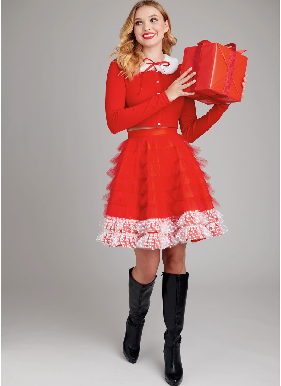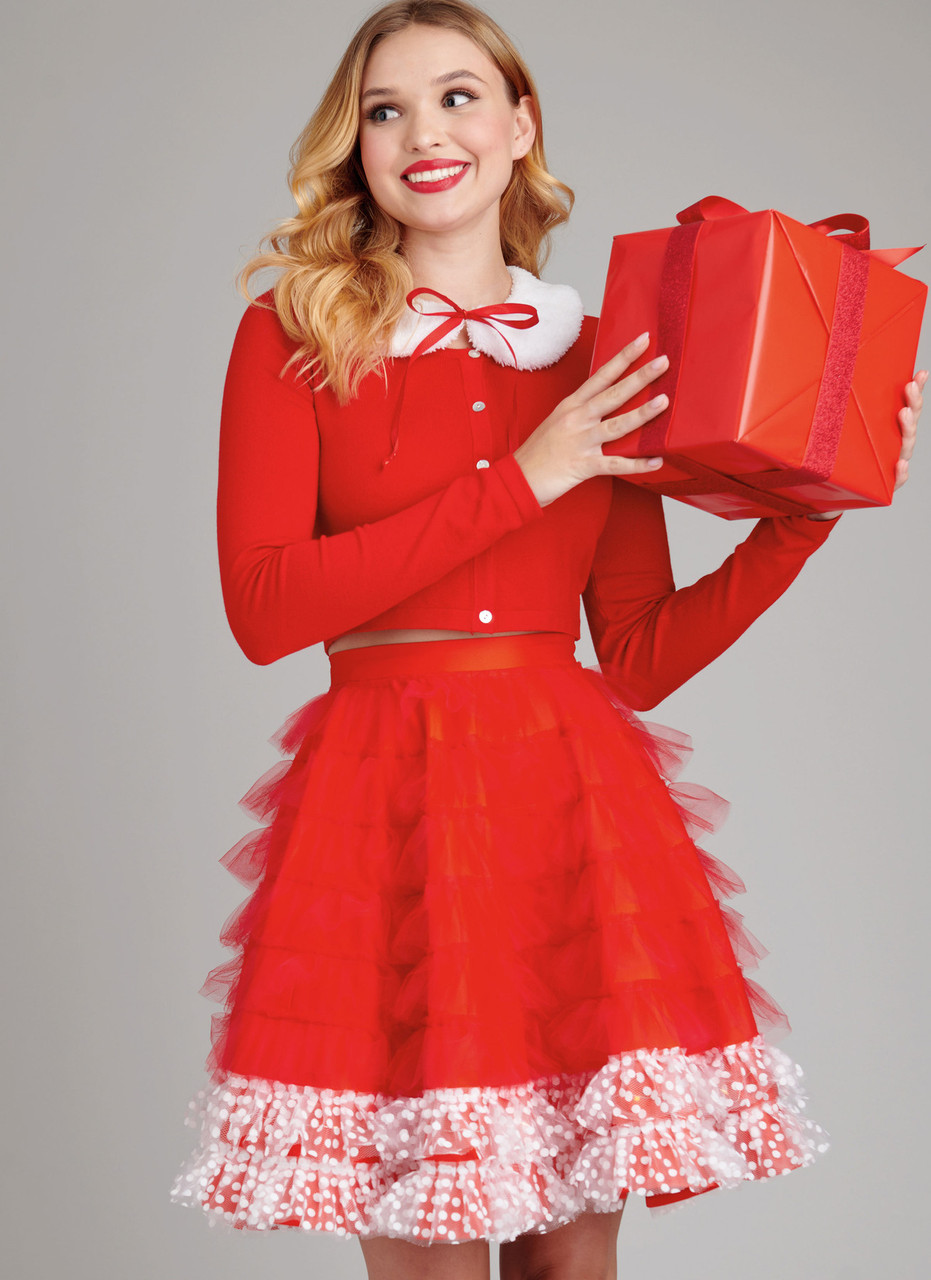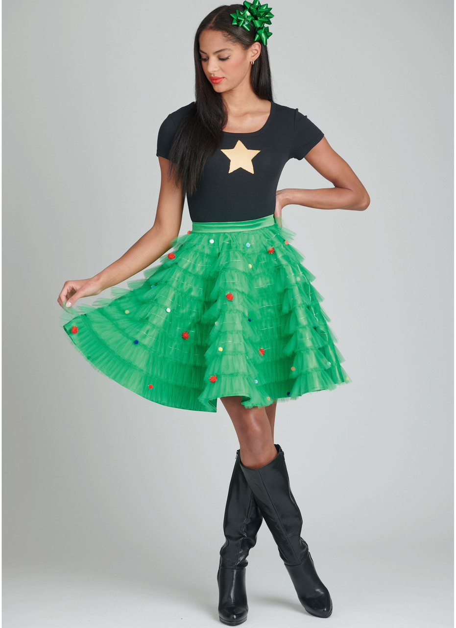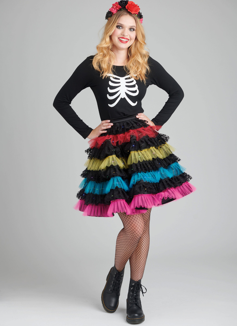 Light it up with circular skirts designed with mini LED fairy lights, battery packs stashed in handy pockets. Above knee length skirts have side zippers and ruffles created by hand-pleating tulle ribbon rolls - no cutting needed! Christmas tree skirt has pom pom ornaments; rainbow skirt and Day of the Dead skirt play with multiple colors. Santa-inspired skirt has lights just at the hem. Star, heart, rib cage appliques and tie on collar accessories included. See envelope for more information.