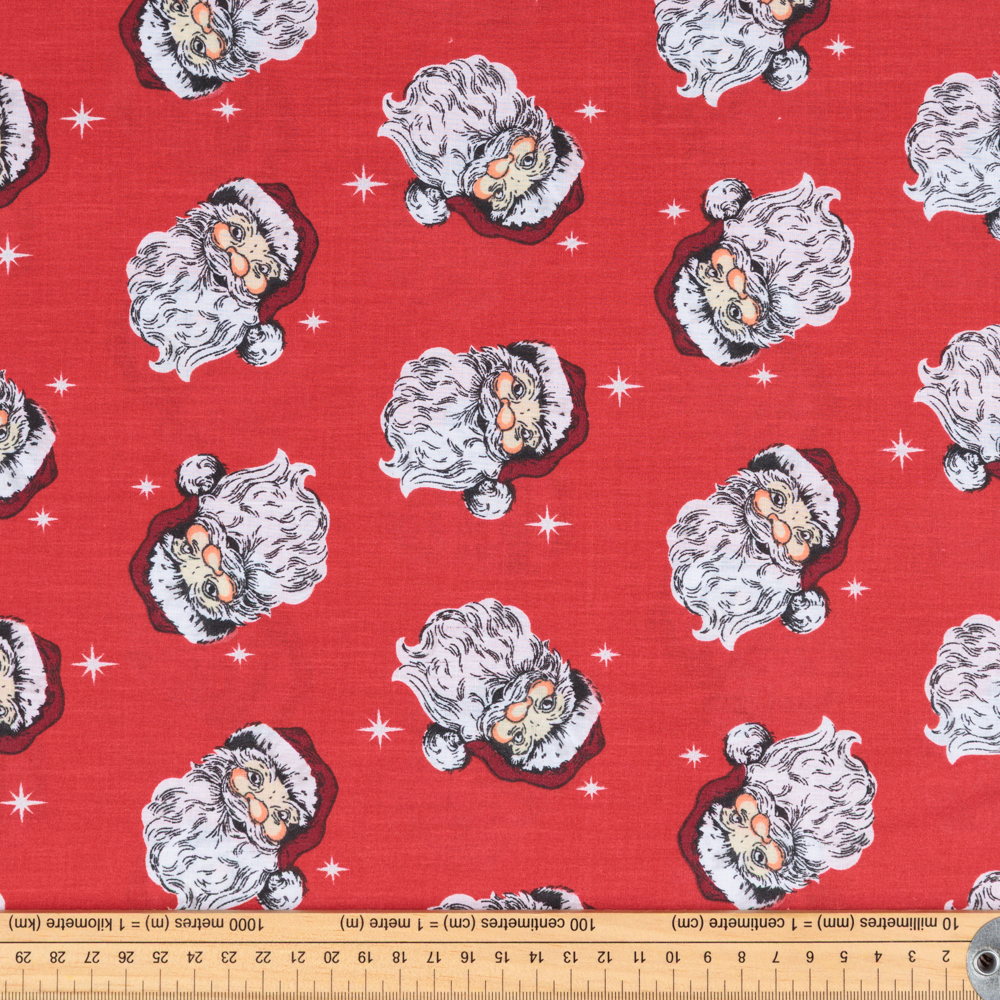 Red base with santa clause heads and tiny holly. Beautiful, high quality, printed fabric. Ideal for quilting, masks, crafts, displays, table decoration and as a dressmaking fabric.