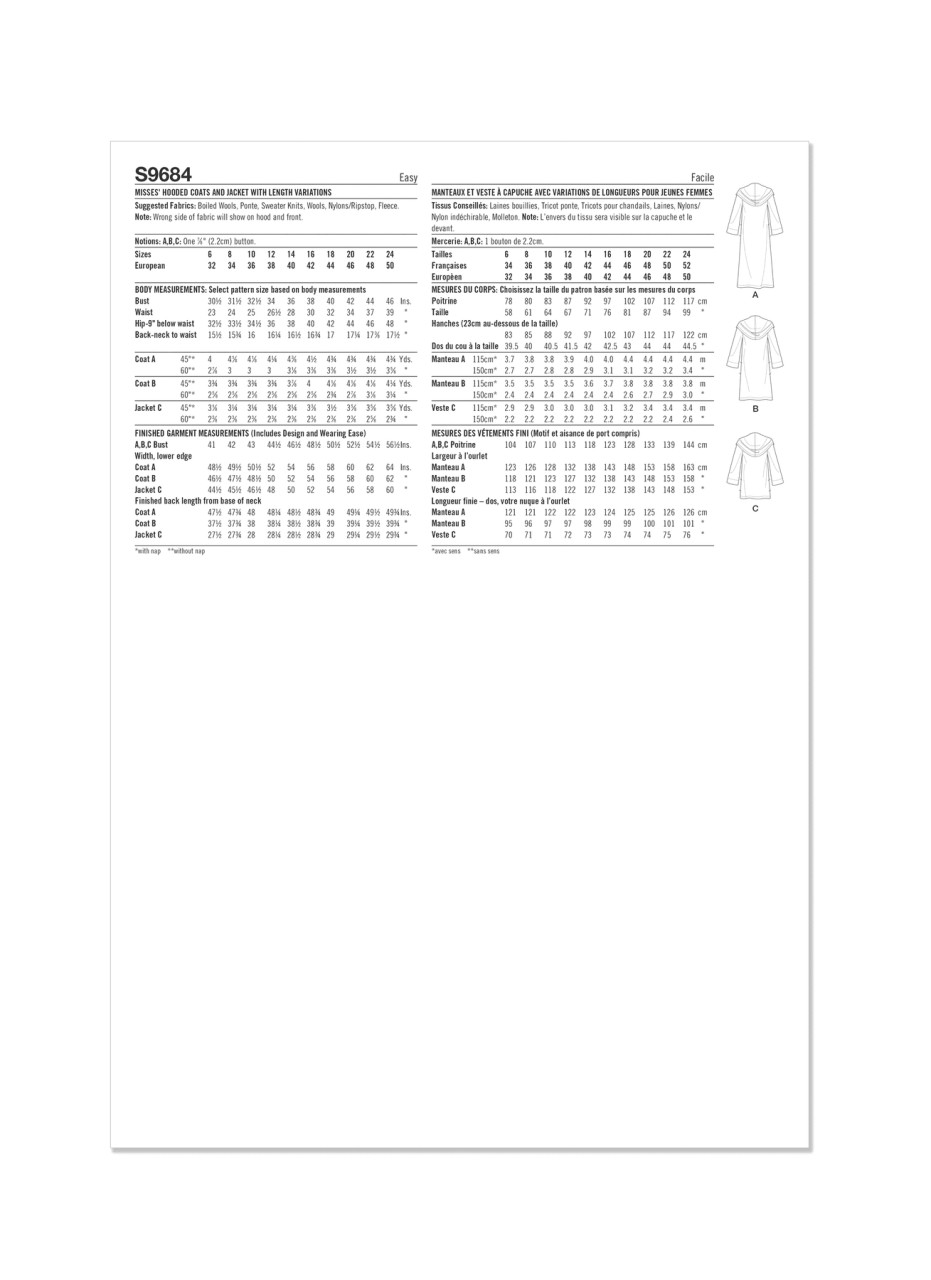 Easy-to-sew coats and jacket have a relaxed fit. Hooded coats and jacket feature one-button closure, side seam pockets, and come in length variations.